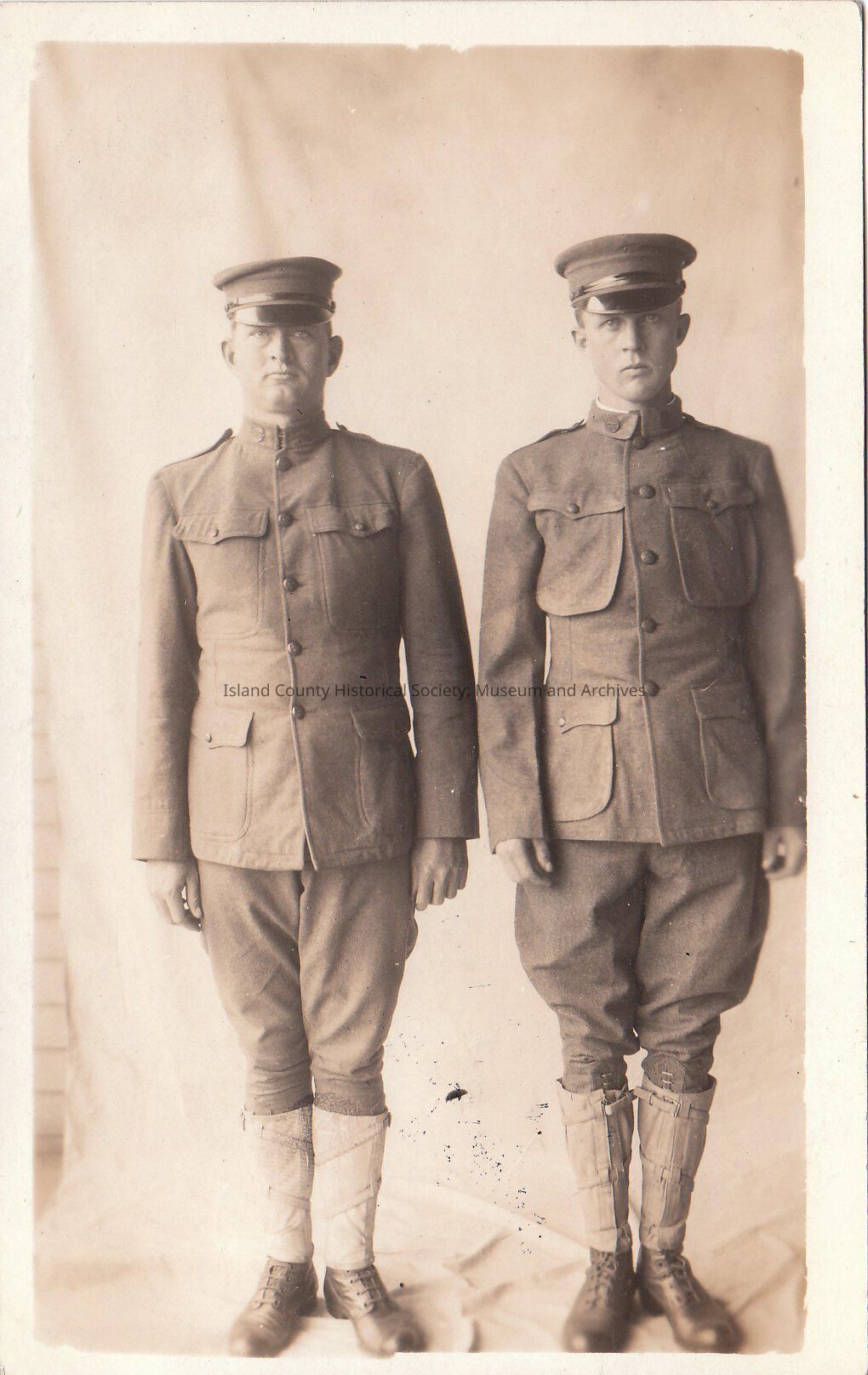 Two soldiers standing at attention in front and on top of a backdrop. Possibly from Fort Casey. AZO postcard issued: 1904-1918.