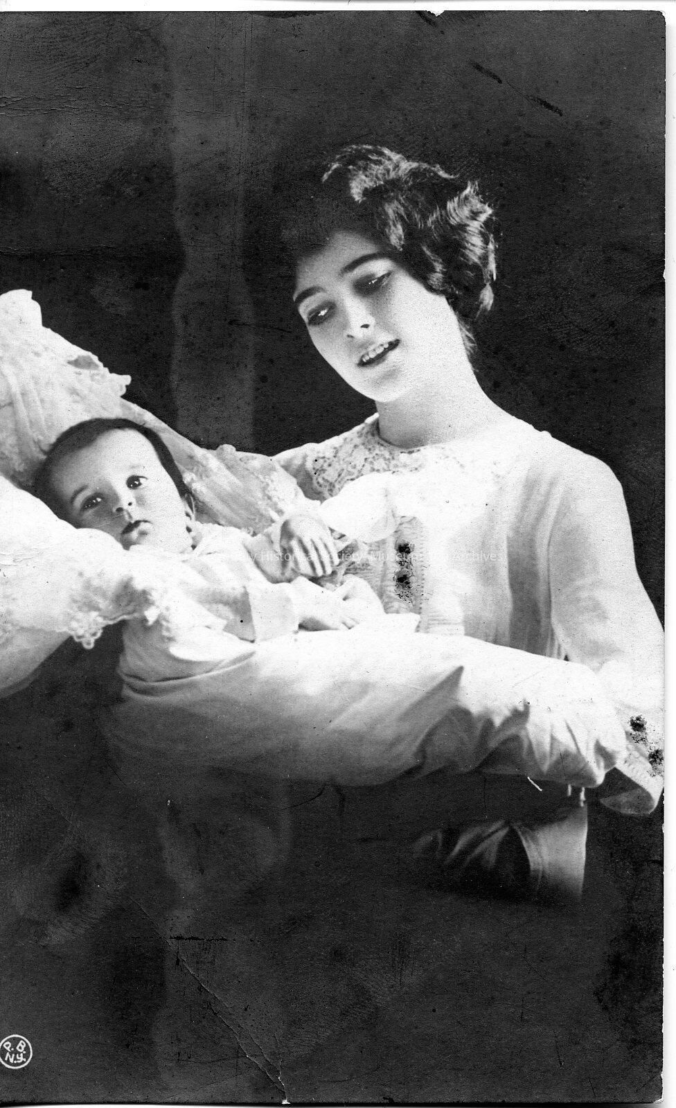 A photo of a woman looking down at a baby. Izett Family Folder.