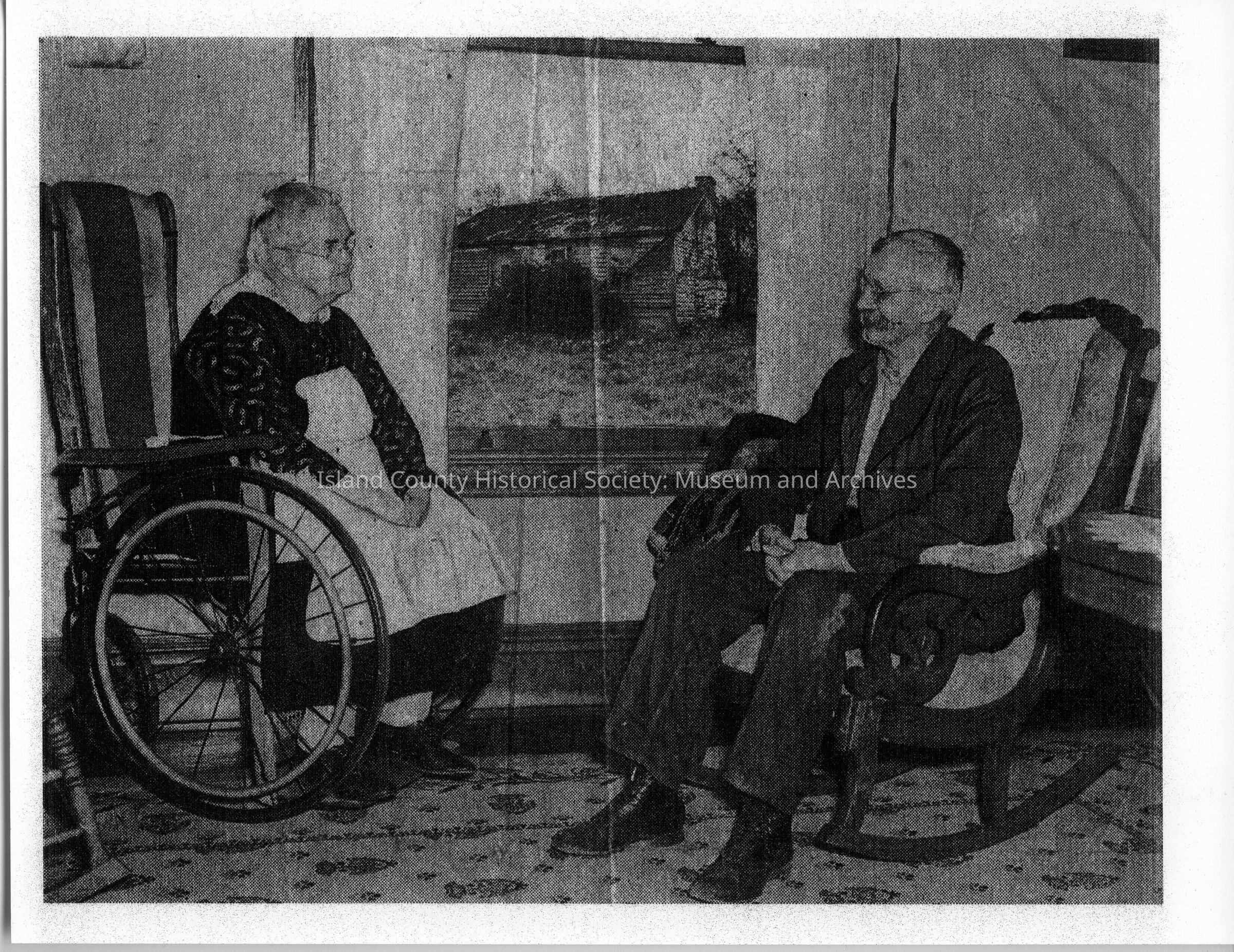 A photo of a woman woman in a wheelchair and a man sitting on a rockingchair looking at eachother. Handwritten on the back is "Izetts - O.H." Izett Family Folder.