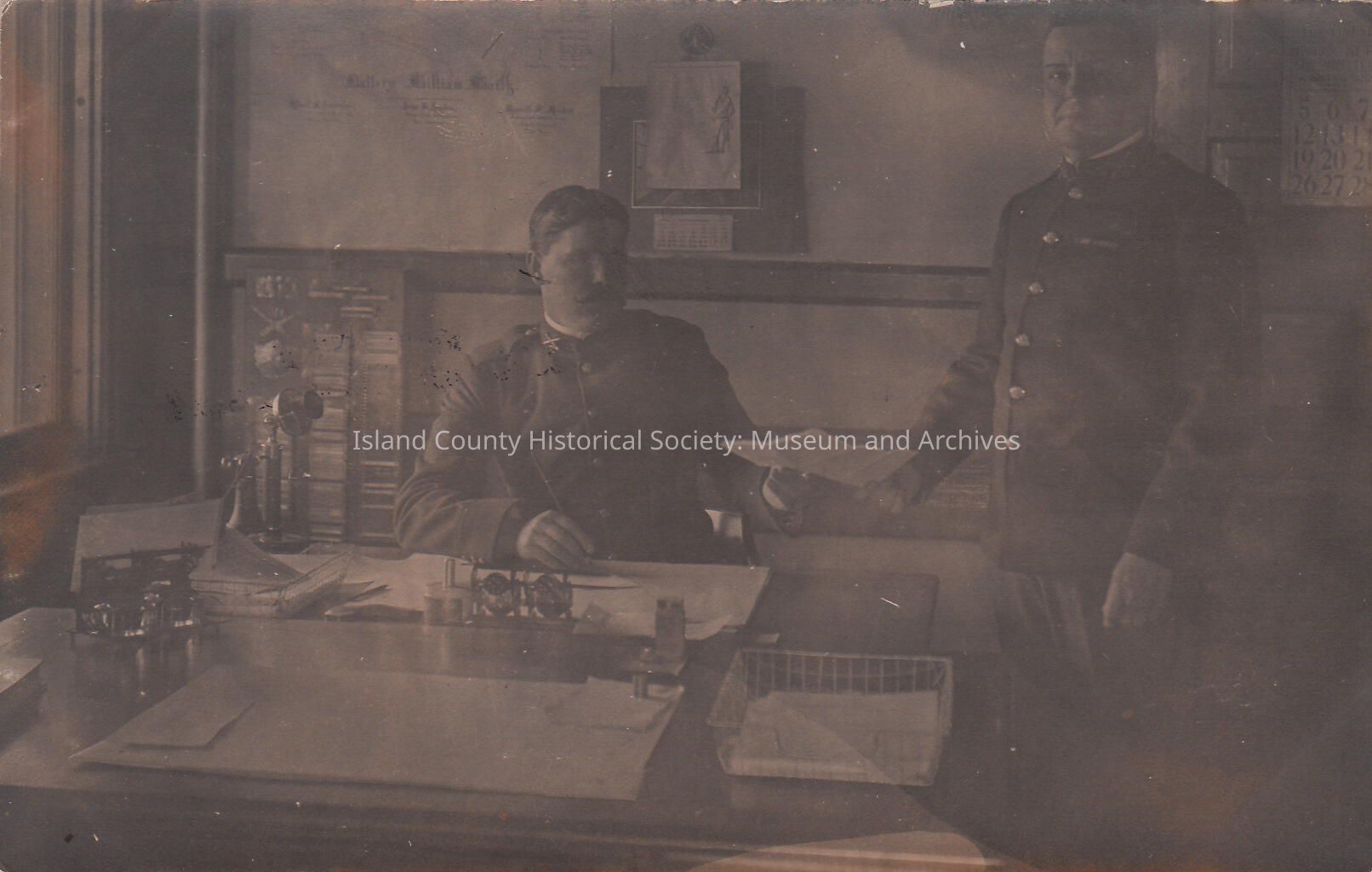 Soldiers in uniform in an office. One standing and one sitting at a desk. Non-dial candlestick telephone is on the desk. Possibly at Fort Casey. AZO postcard issued: 1904-1918.
