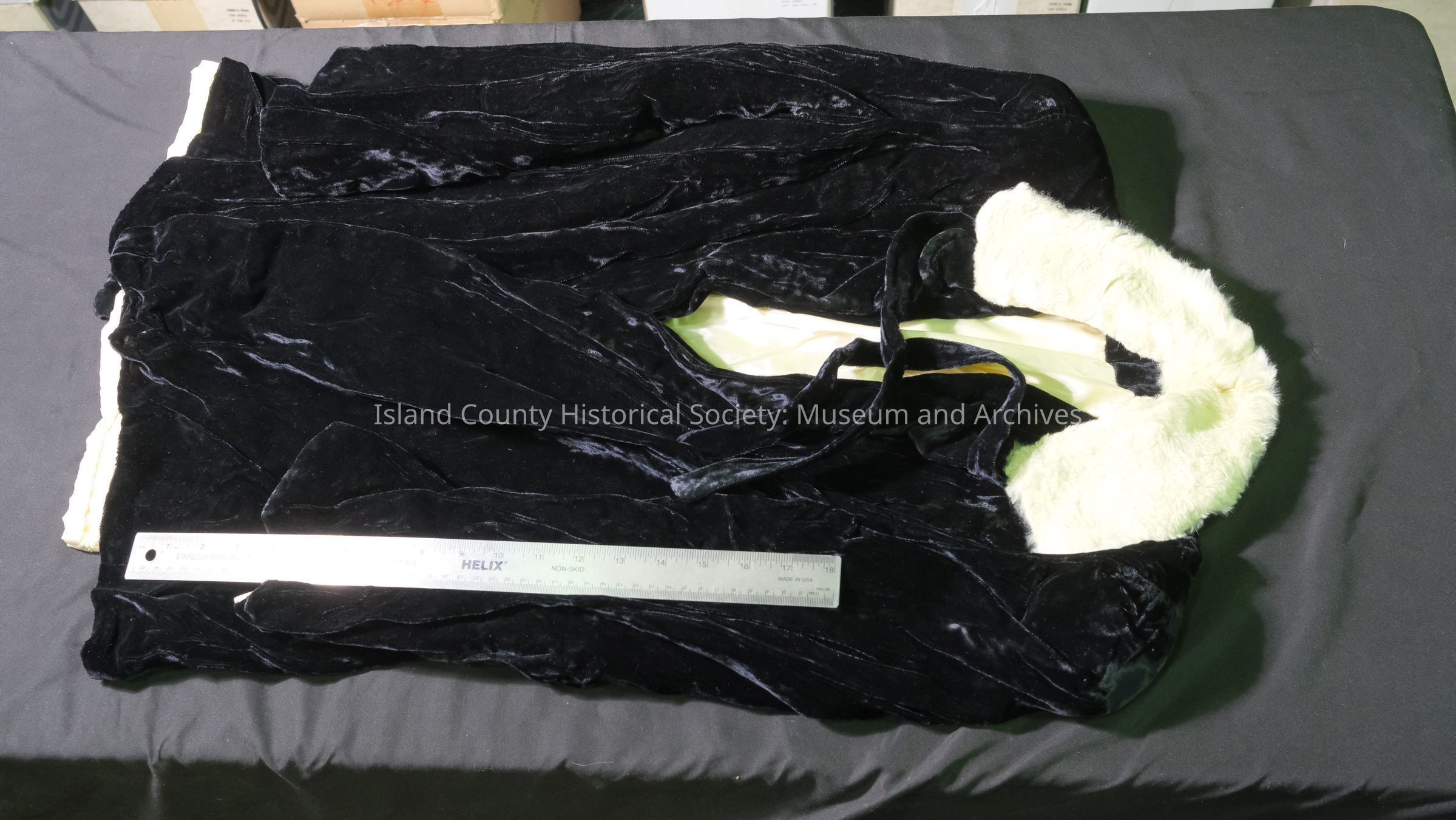 Velvet cape with white ermine fur. Worn by Beth Patmore's daughter, JoAnn, in 1940.