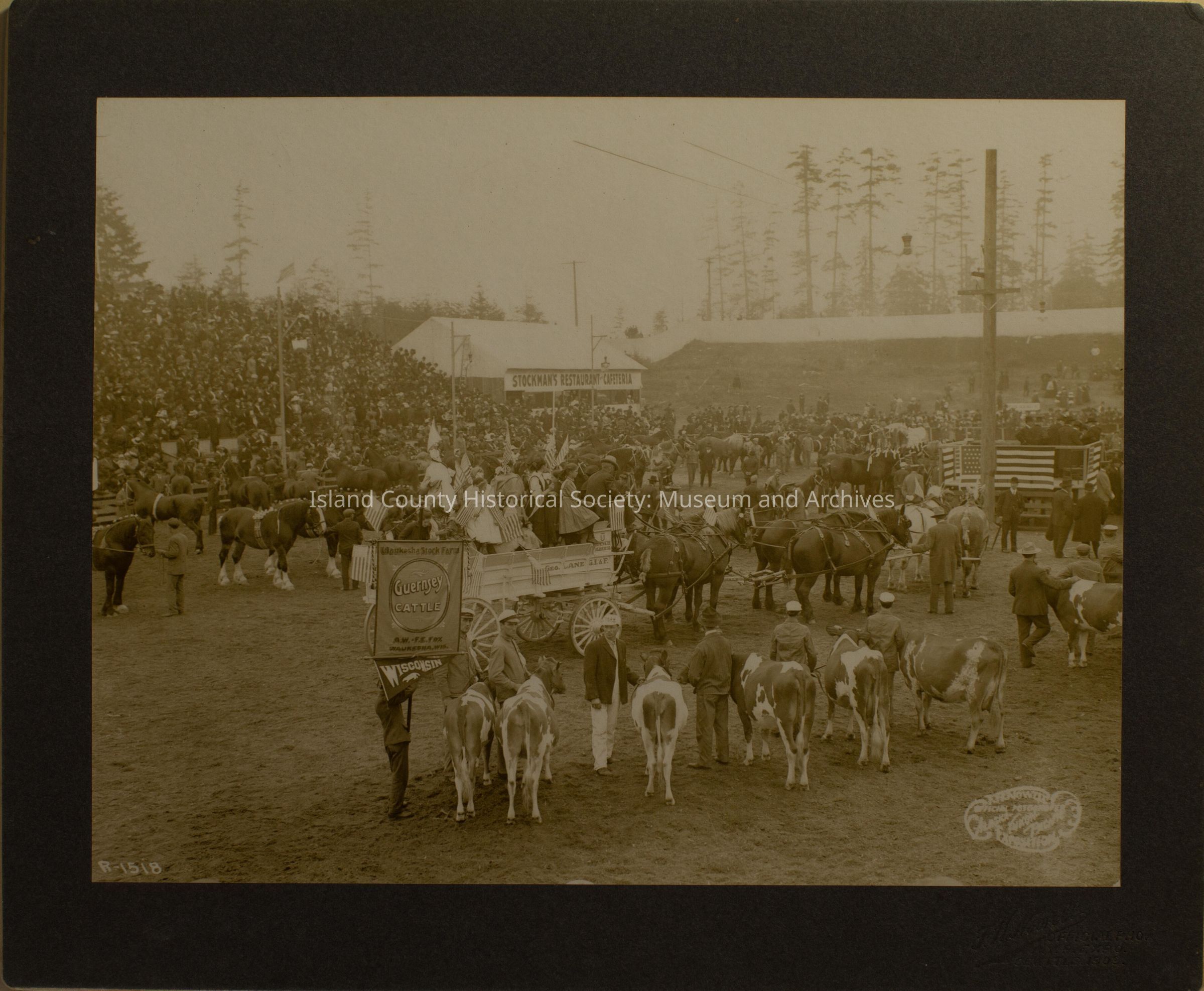 A photo of cattle with men standing by each, a sign saying "Guernsey Cattle." There are also many horses and a cart pulled by horses. There are many people in the seats looking down. A sign above a building says "Stockman's Restaurant Cafeteria." Handwritten on the back is this "William S. Izett imported first registered gernsey bull - from Wisconsin."