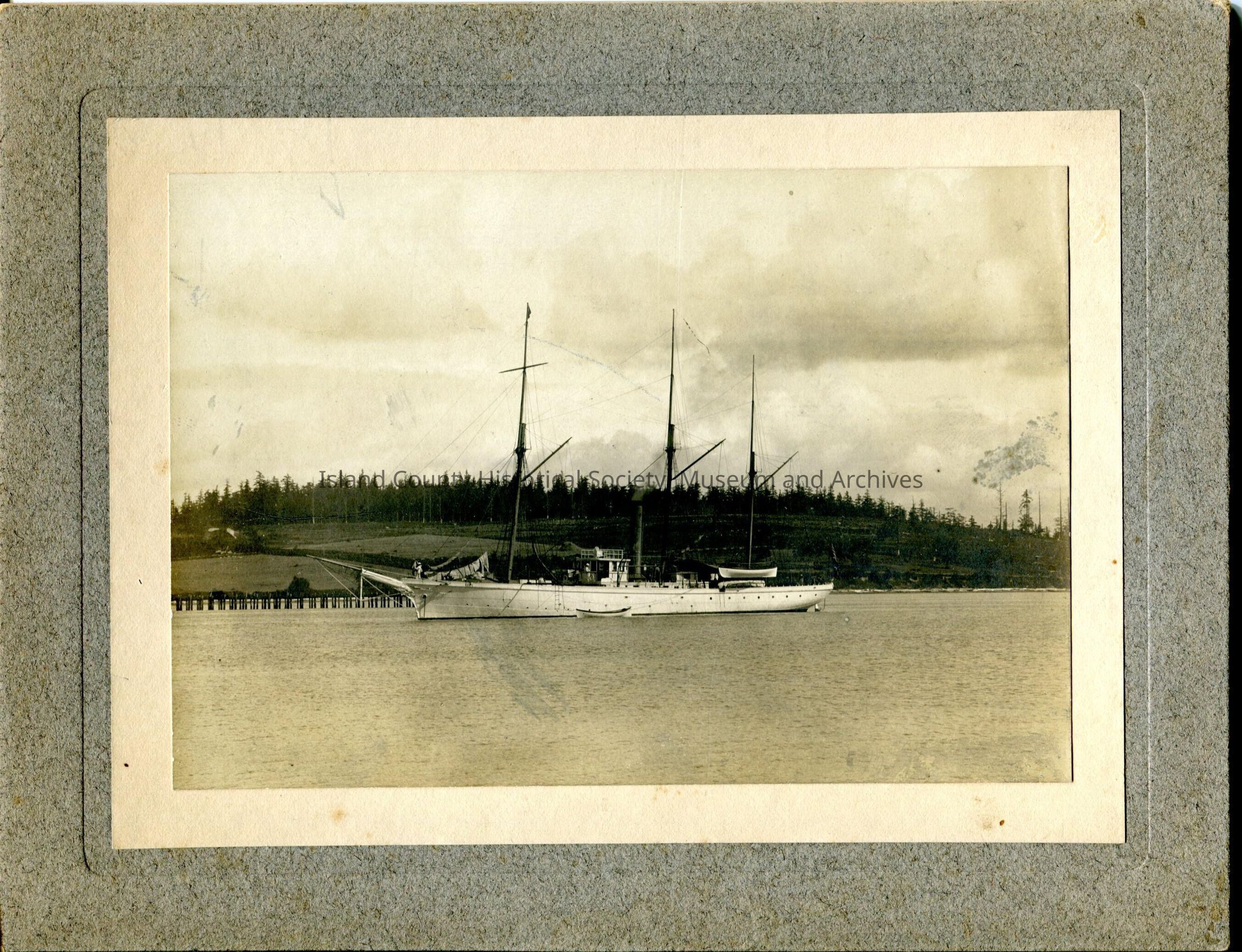 A black and white photo of a three-masted ship. On the back: Coast Guard Cutter Bear about 1894 or 96- Photo by John Maylor.