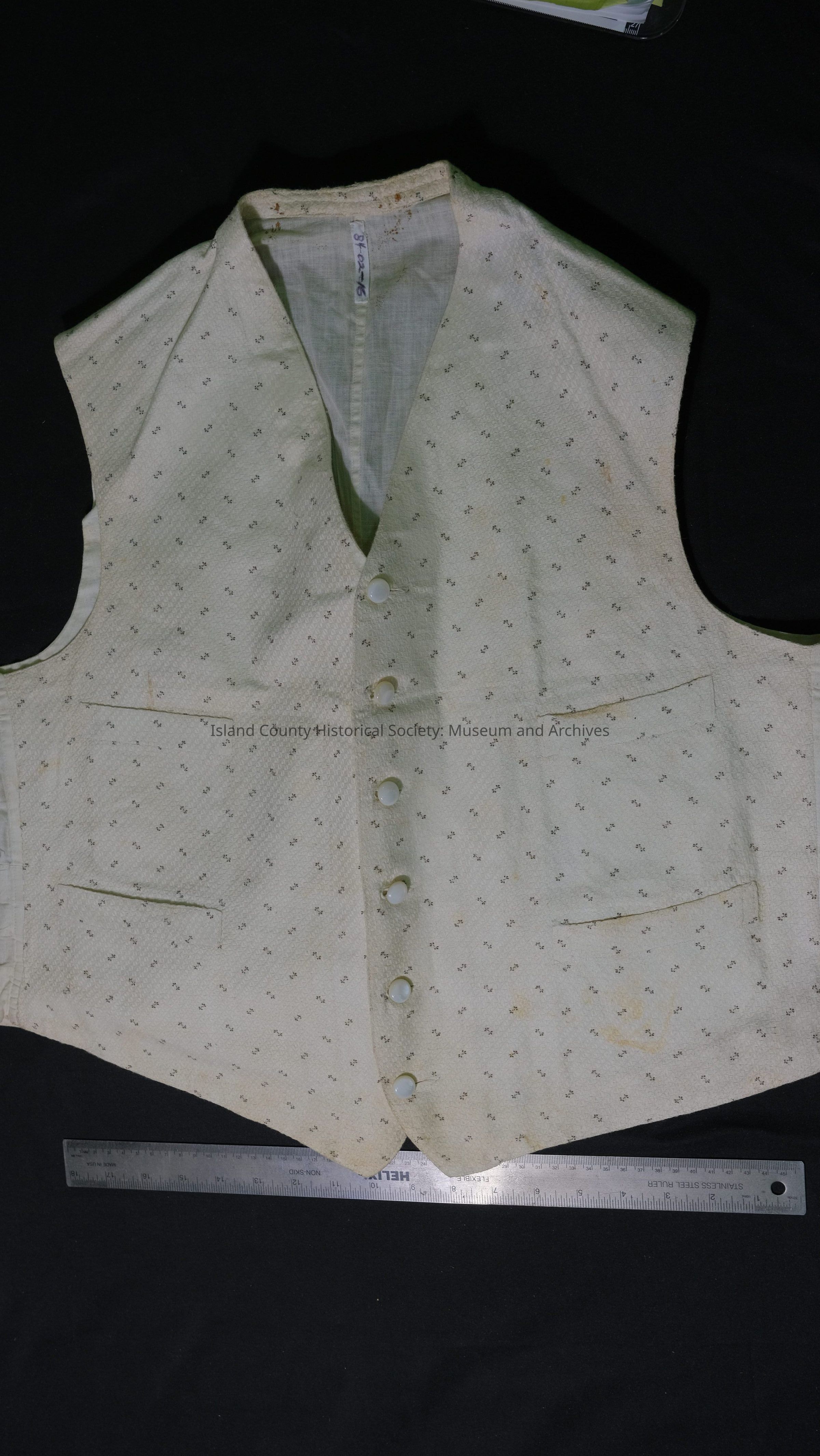 Man's vest, white, black figure, worn by Mark Wangsness.