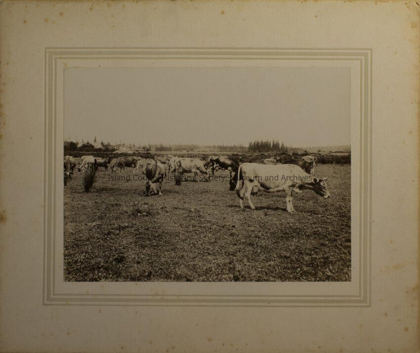 A photo of cattle in a field. There is a farm in the distance. Handwritten on the back is "Izett/ Guersney Herd."