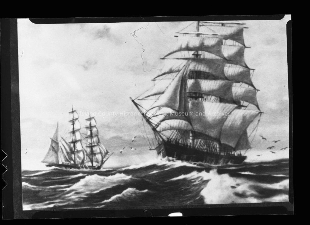 A black and white negative of a two tall ships in full sail; ship sailing towards artist has three masts, 3 sails on bowsprit. Ship sailing opposite direction has two masts. Looks like a photo of a painting.Made/Created
