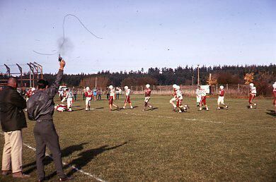 Writing on the slide states End of game. Coupeville football game. Date written on slide states 10/25/69. Color transparency.