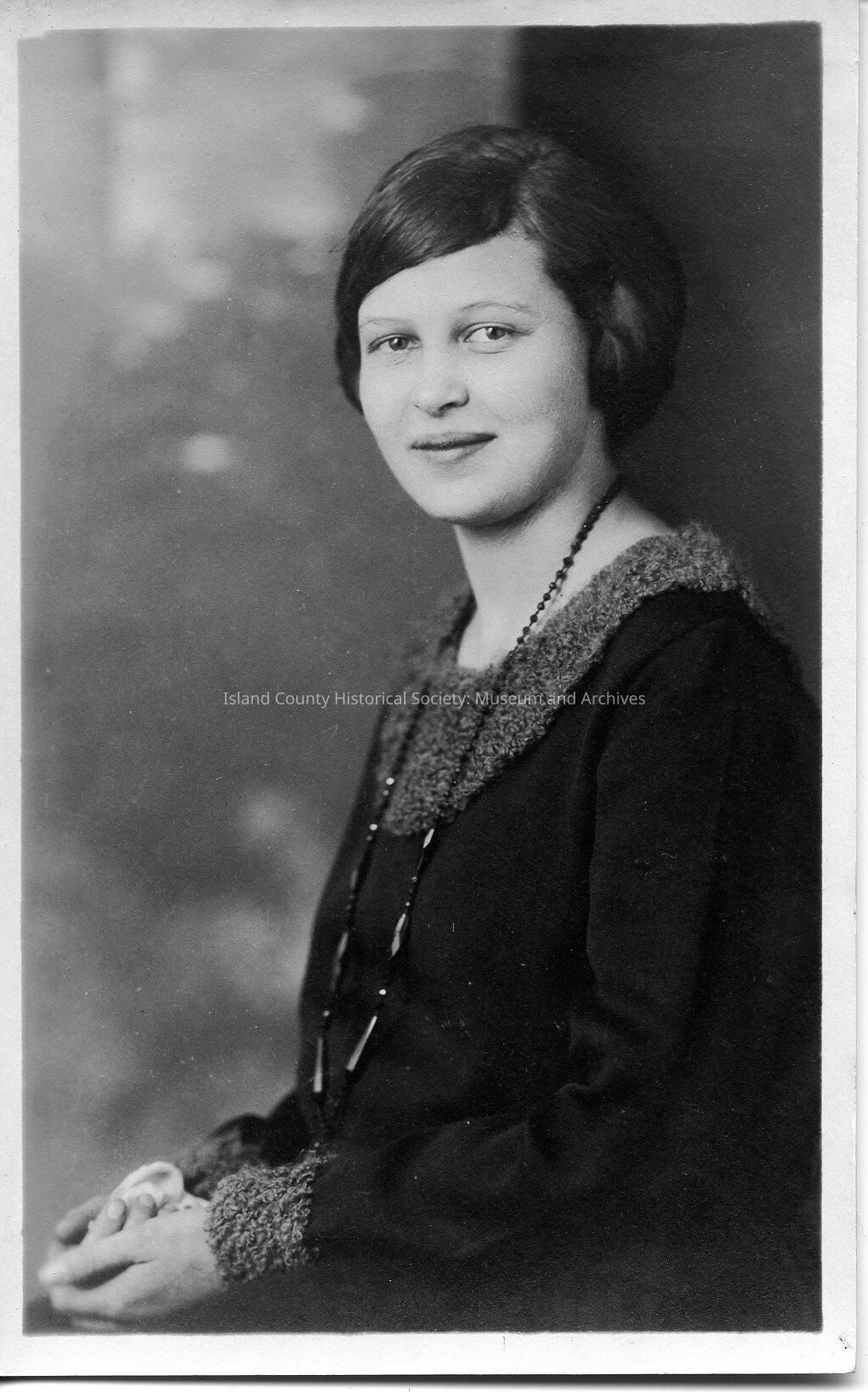 A portrait photo of a woman, dark hair, with a necklace of beads around her neck. In Izett Family Folder.Made/Created