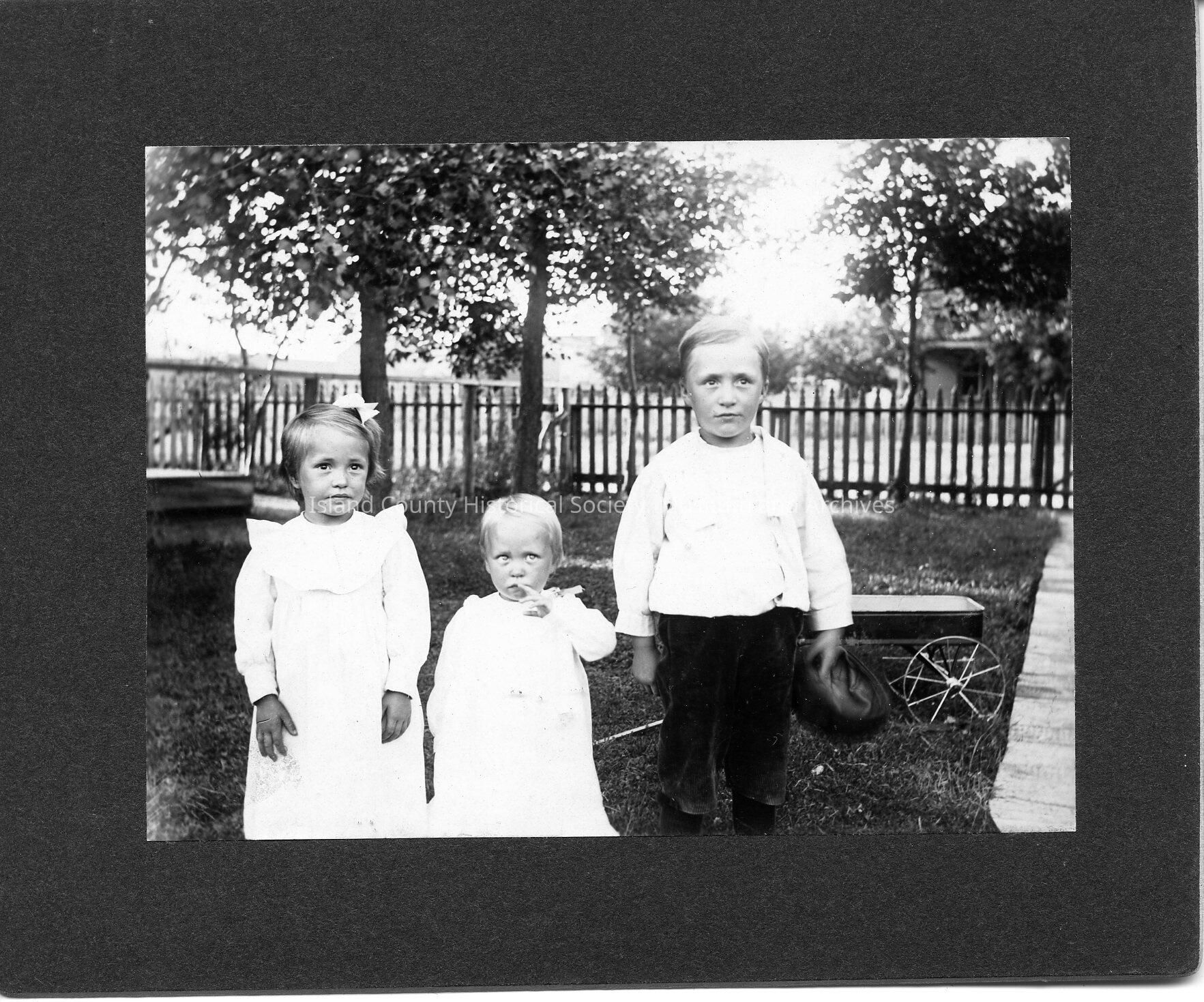 A portrait photo of three childern in maybe their backyard. Trees in the background and a fence. Izett Family Folder.