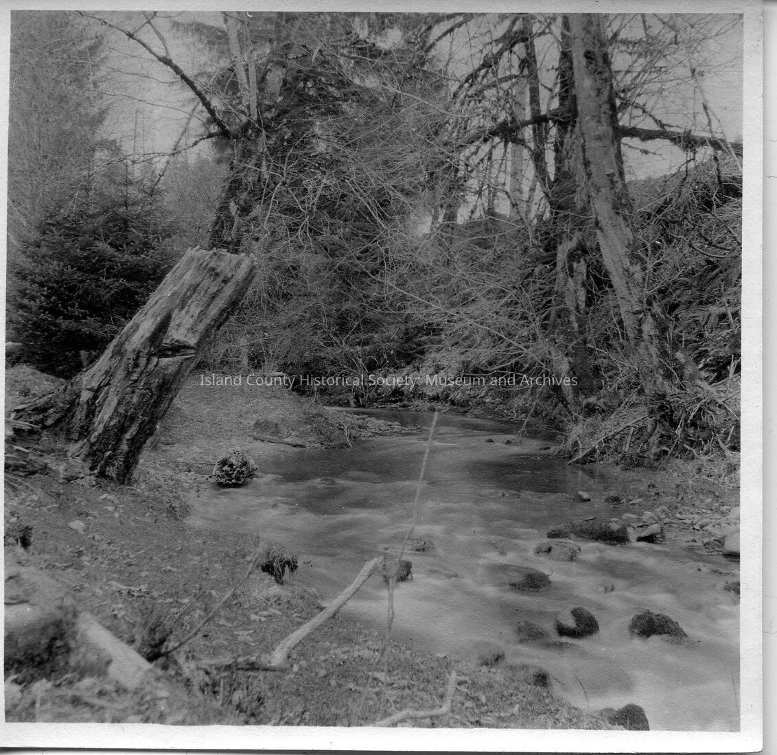 A photo of a creek/river between trees. Handwritten on the back is "Uncle." Izett Family Folder.
