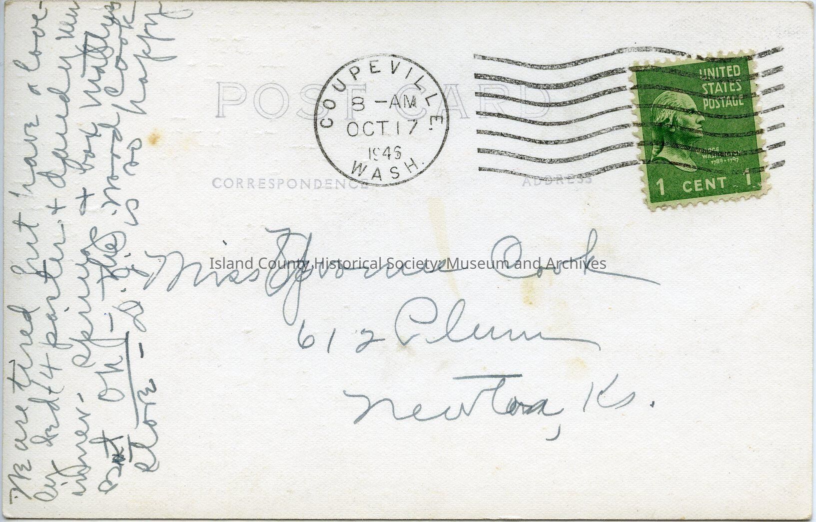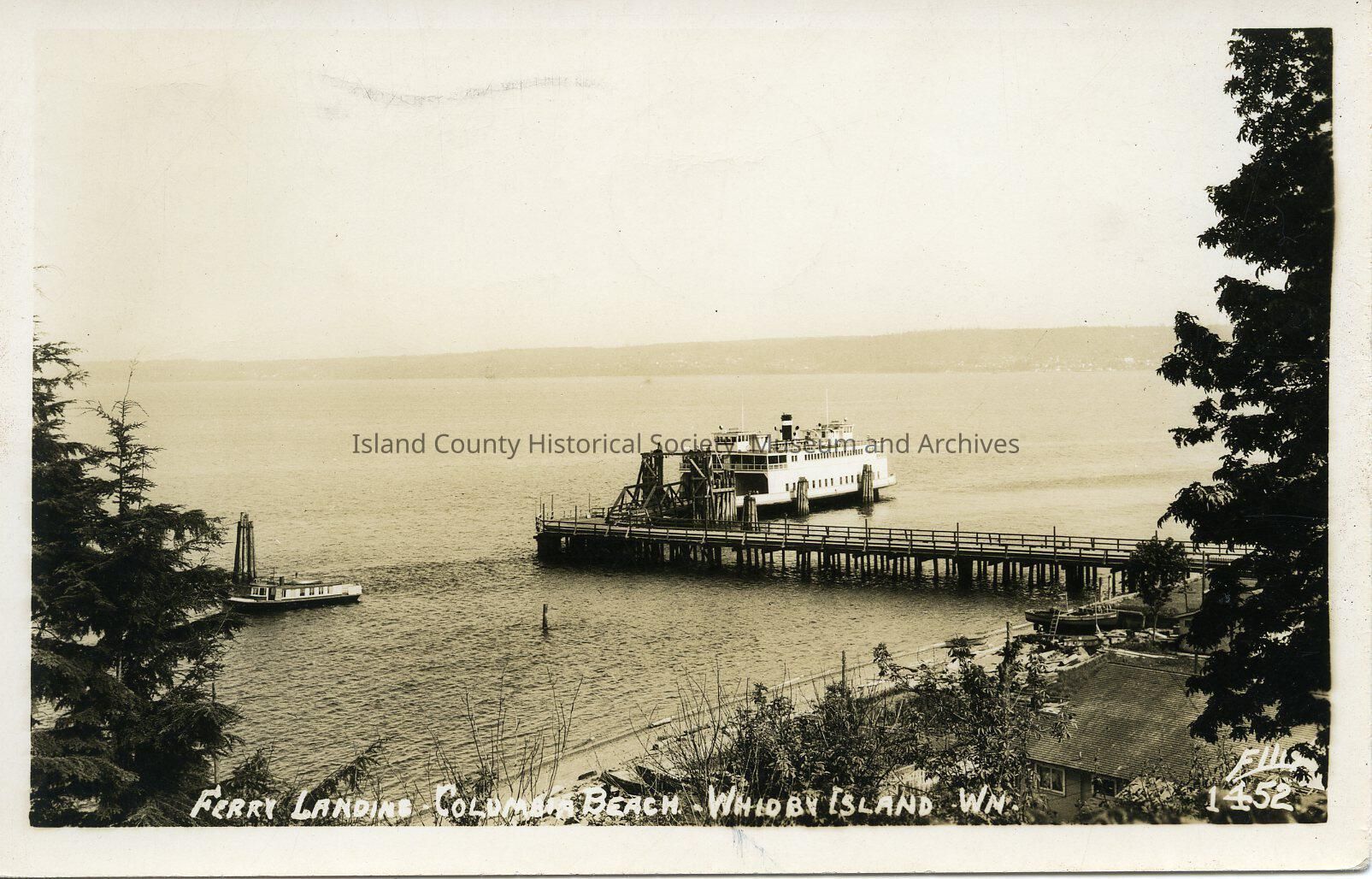 Postcard of a ferry at the pier/wharf. A smaller boat on another pier. The caption reads: Ferry landing - Columbia Beach - Whidbey Island, WN.