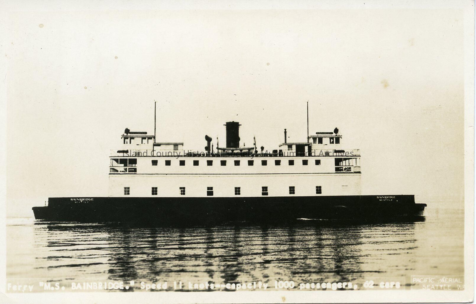 Postcard of a ferry. The caption reads: Ferry "M.S. Bainbridge" speed 11 knots - capacity 1000 passengers.