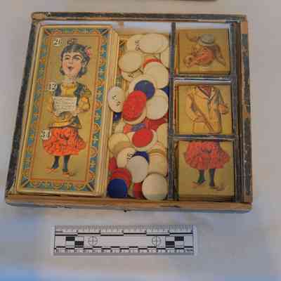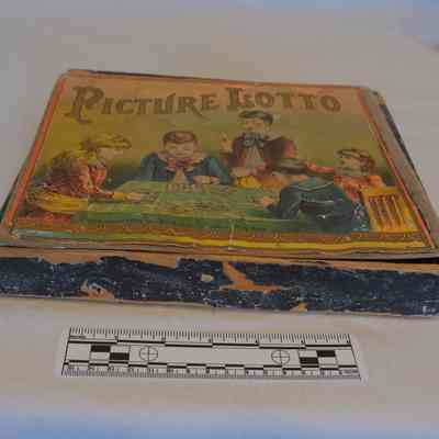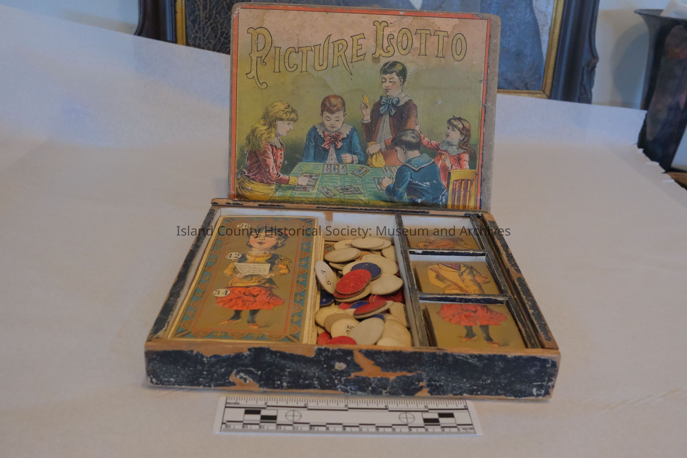 A high-quality game made by McLoughlin Brothers of New York, "Picture Lotto" is packed in a wooden box with a sliding lid. The illustration on the lid shows children playing the game. Lotto became popular in America during the late 19th century as a children's game. This example, for young children, involved matching pieces of whole pictures to the appropriate space on a board showing the whole. Lotto games such as this led to the introduction and popularization of the game Bingo, popular today.