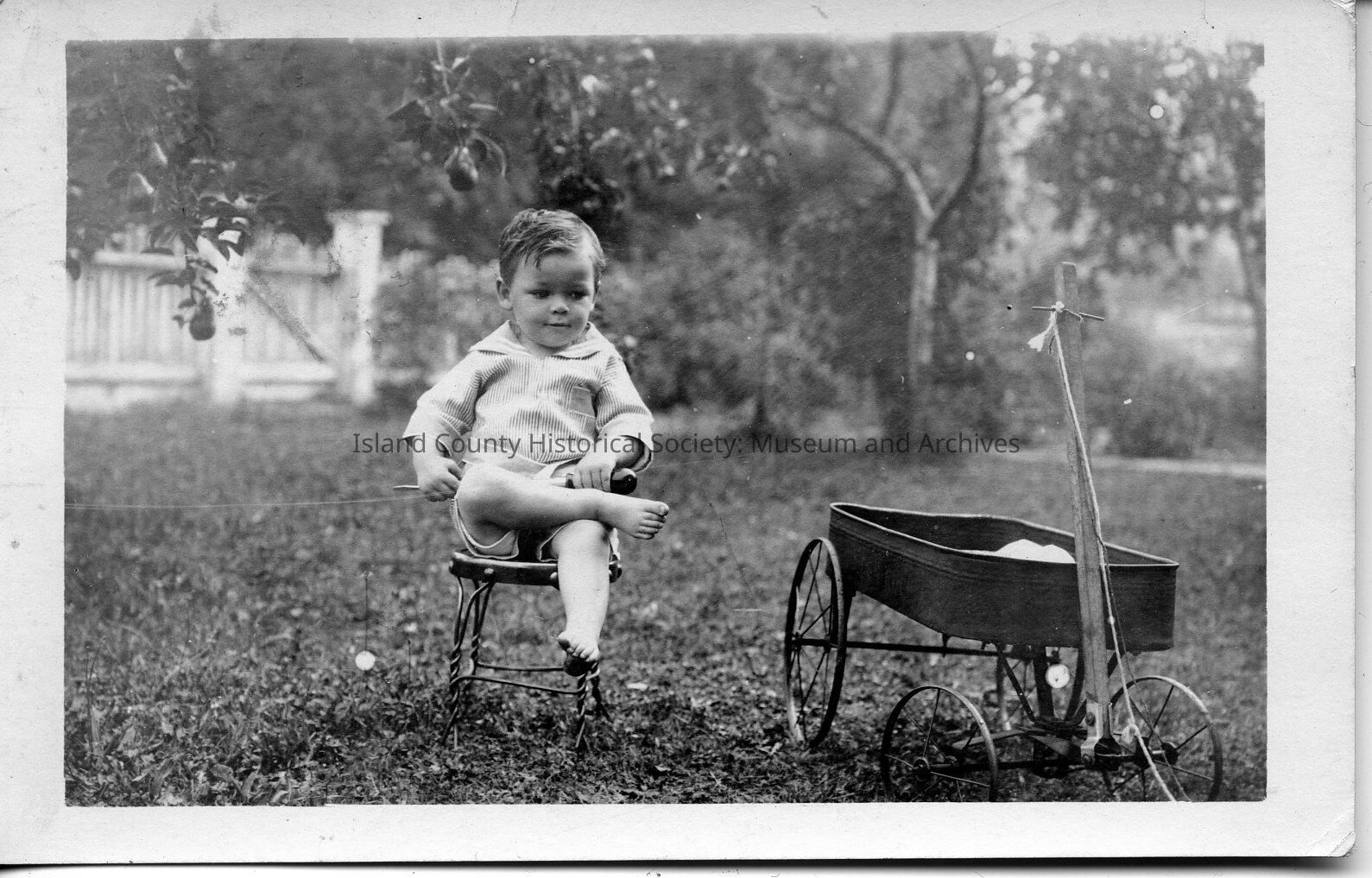 A photo of a barefoot child sitting on a chair next to a wagon, with a pear tree behind him. Handwritten on the back of the postcard is to: "Wm. F. Izett. (from) Waddingtor " Izett Family Folder. Stamp postmarked Dec 24, 1917.