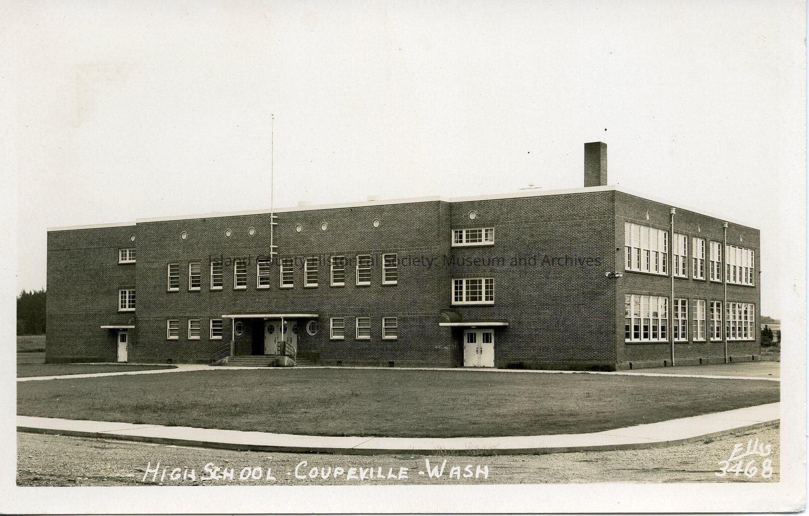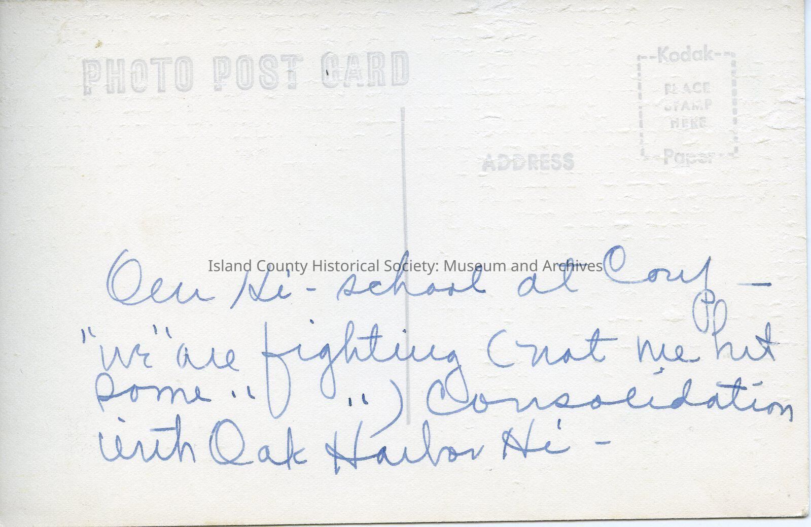 Postcard of Coupeville High School. Caption: High School - Coupeville, Wash. On the back: "Our Hi-school at Coup - "we" are fighting (not me but some " " (are fighting)) consolidation with Oak Harbor Hi - "