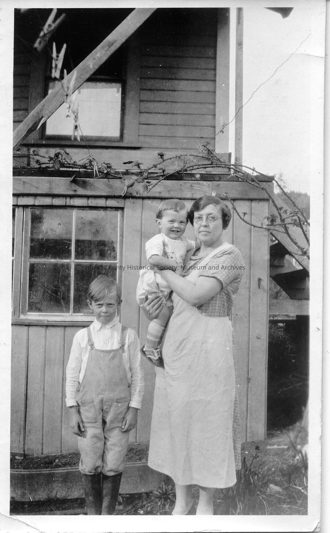 A photo of a woman holding a baby with a young boy at her side outside a building. Izett Family Folder.