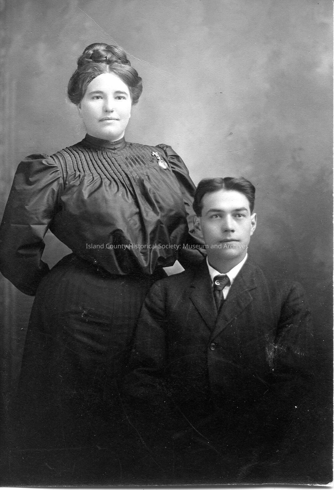 A photo of a couple. Woman standing and man sitting. Izett Family Folder.