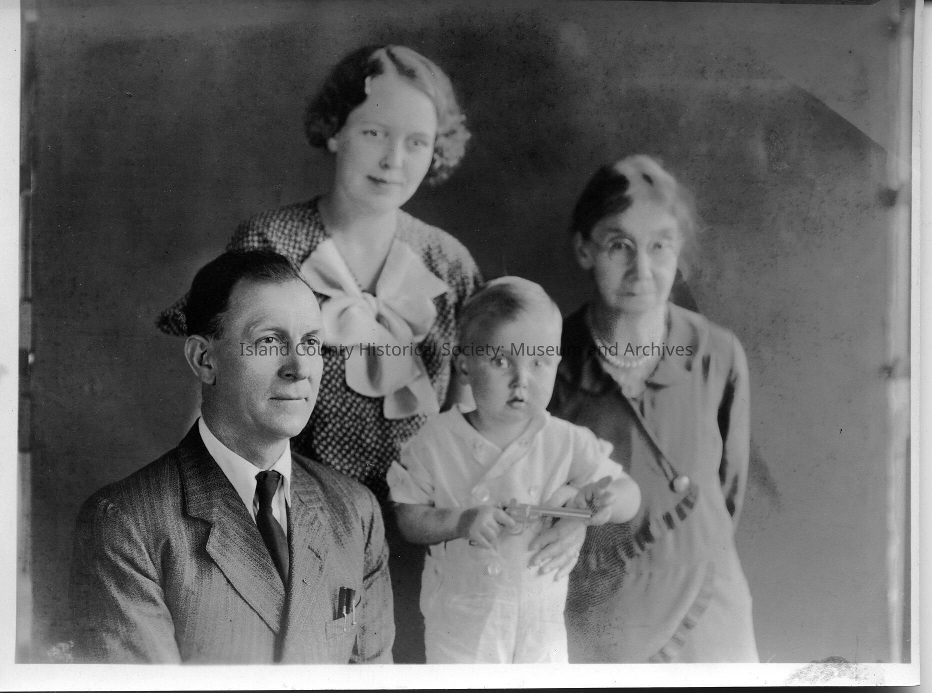 A photo of a family with a man, his wife, a very young child, and (?) a grandmother. Izett Family Folder.