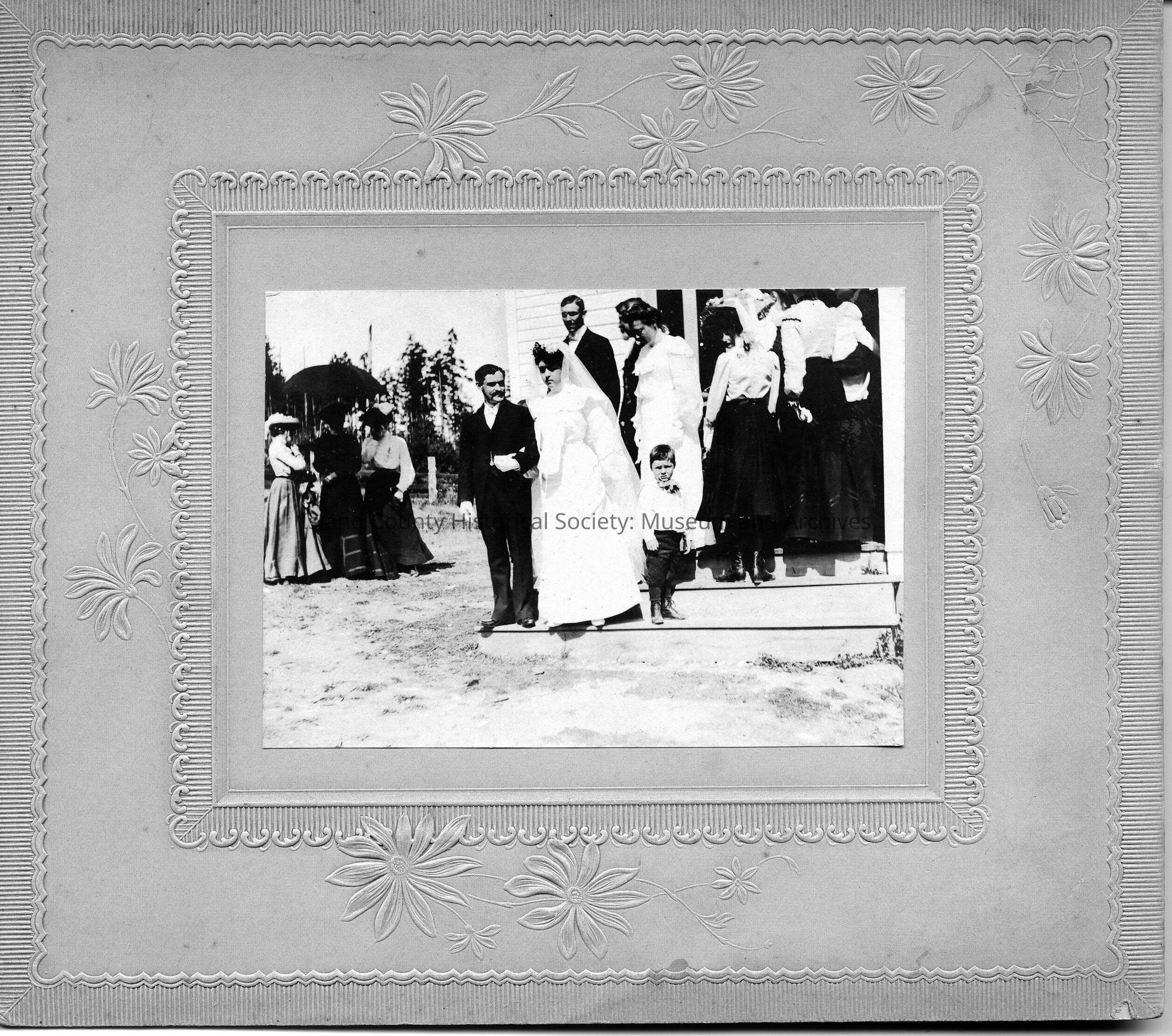 A photo of a wedding with the bride and groom coming down the stairs of the chruch to outside, There are other people behind them and a few ladies on the lawn. In Izett Family Folder.
