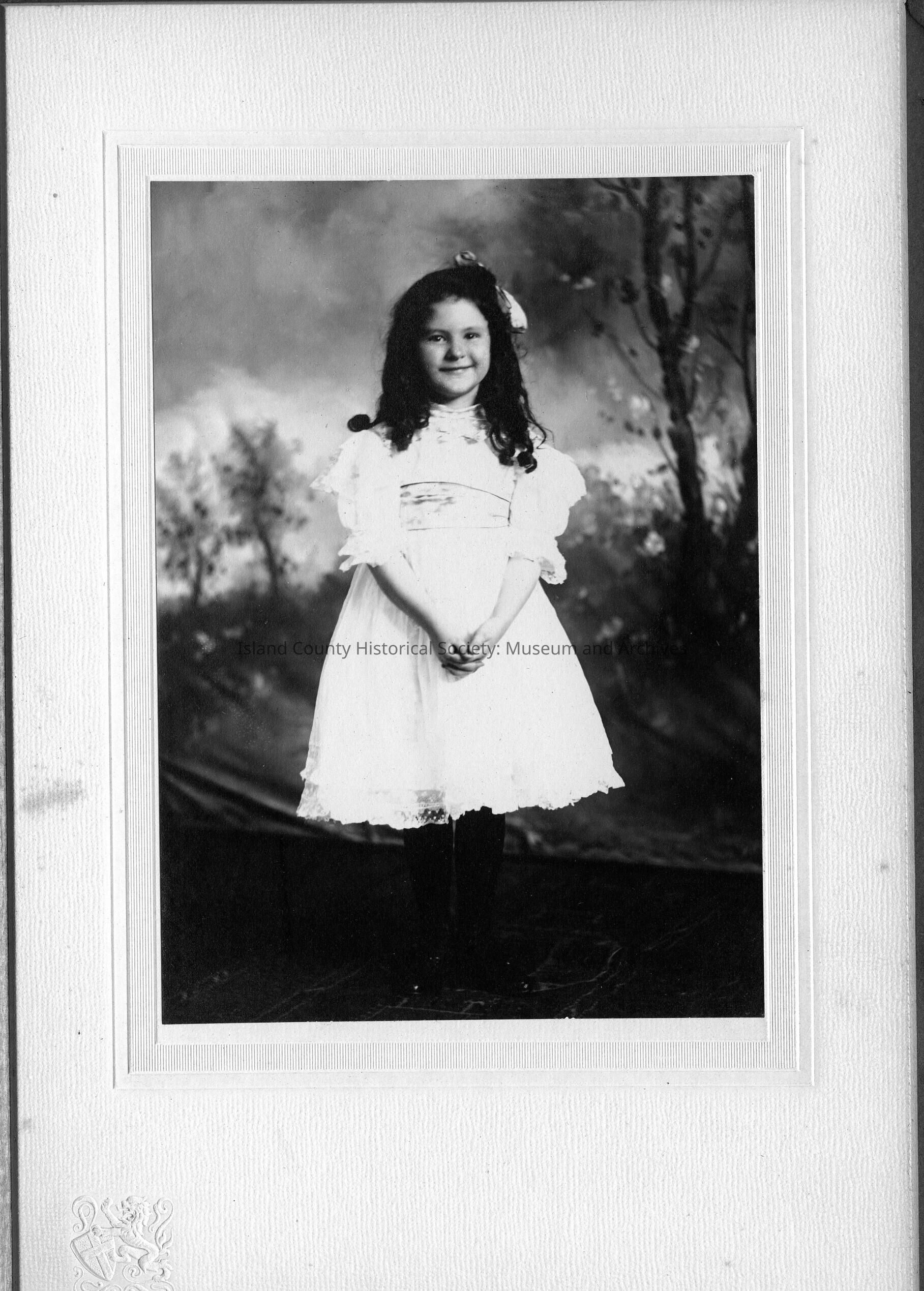 A photo of a young girl in white dress. The photo is in a grey folded frame. In Izett Family Folder.