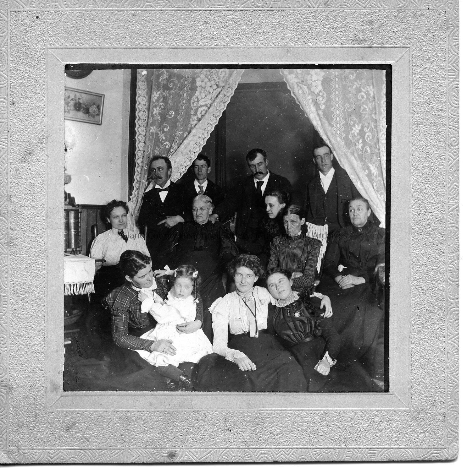 A photo of a family inside a home. Standing and sitting. Handwritten on the back is "Possibly Frosttad family" In Izett Family Folder.