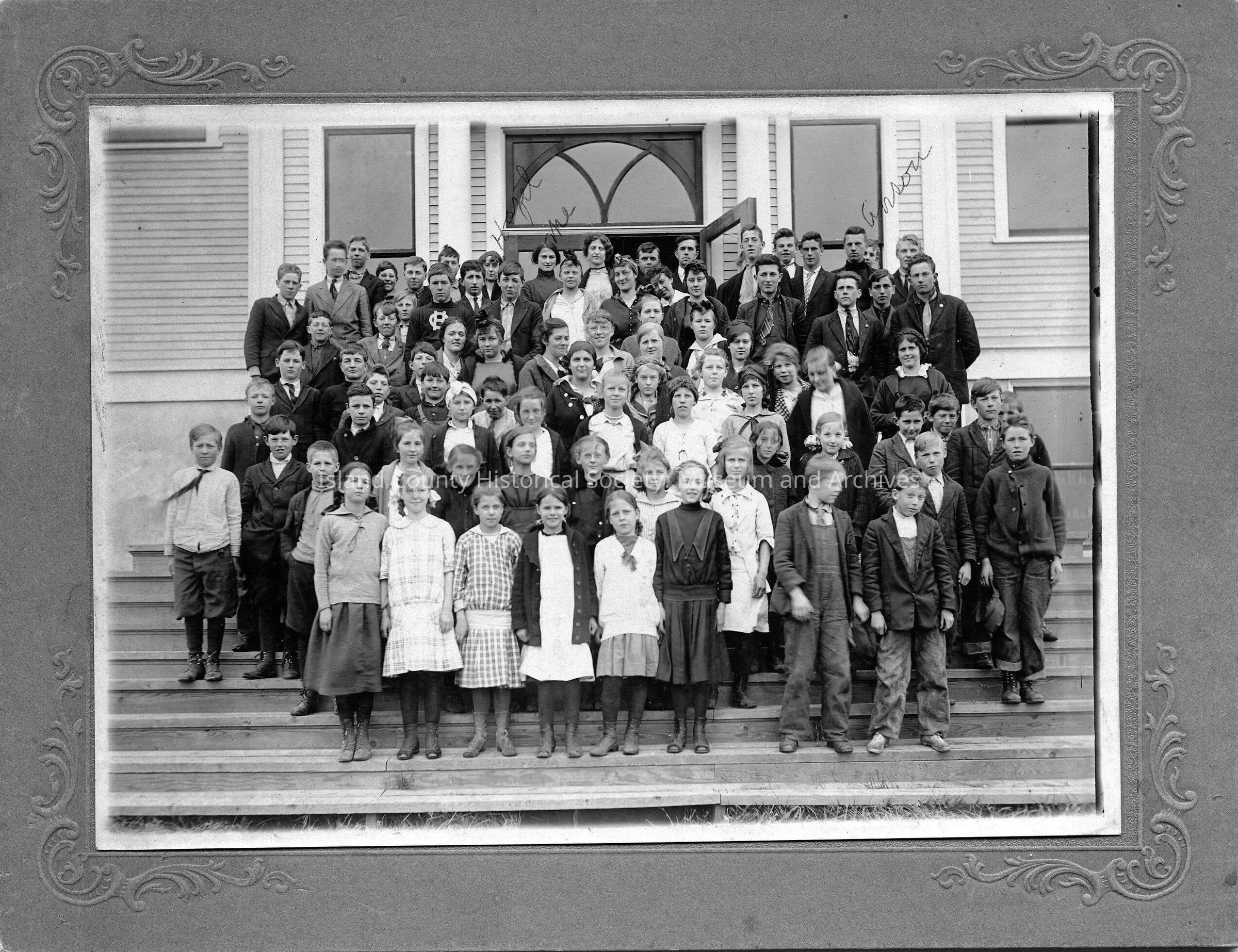 A photo of a whole school class outside their school. Handwritten on the back is "1917, Vera Cleveland (me). Brother Anson Cleveland." In Izett Family Folder.