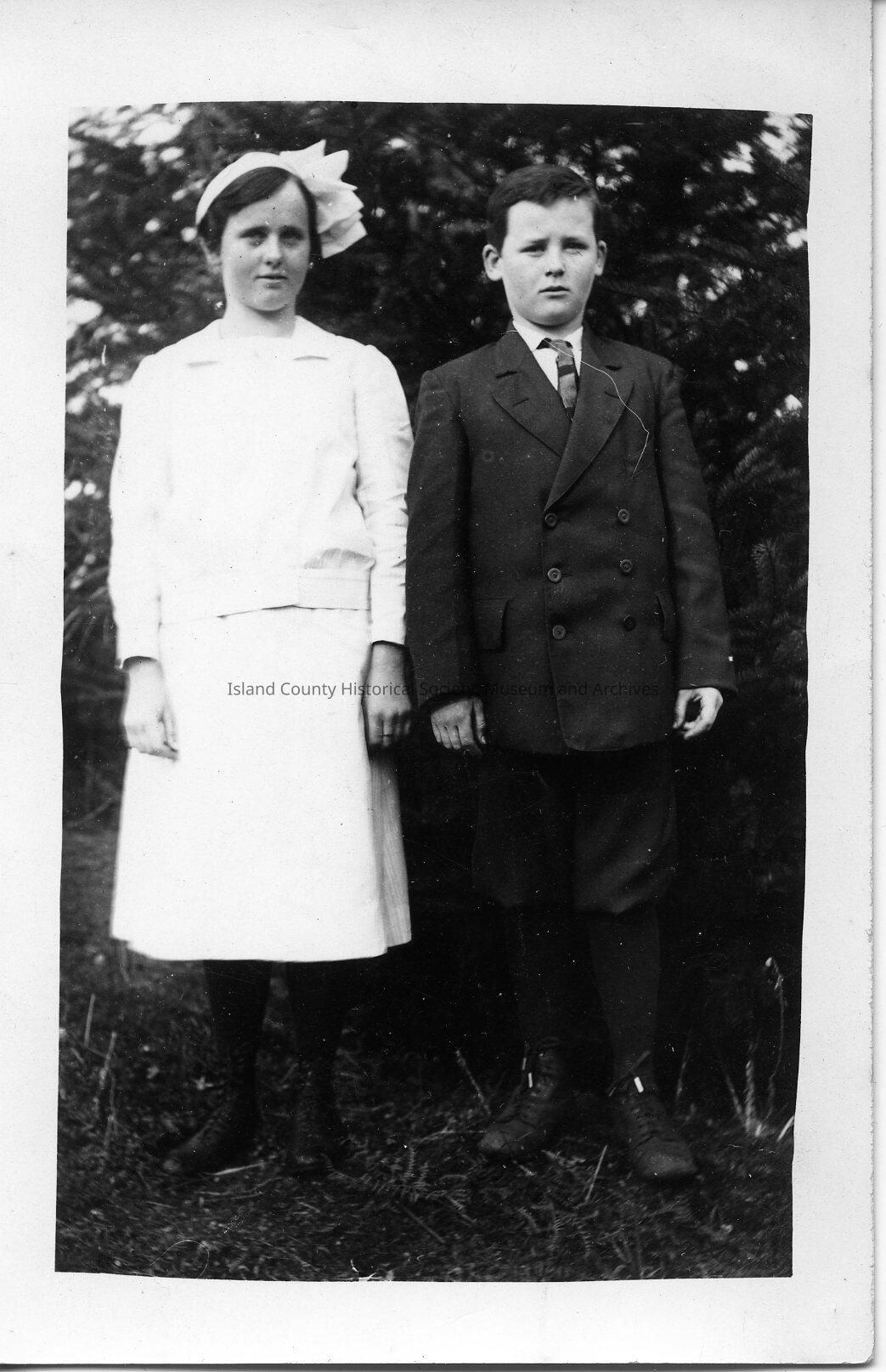 A photo of a girl and a boy outside. Handwritten on the back is Adessa and Charles Devlin, Oak Haebor, Wash., July 26, 1914." In Izett Family Folder.Made/Created
