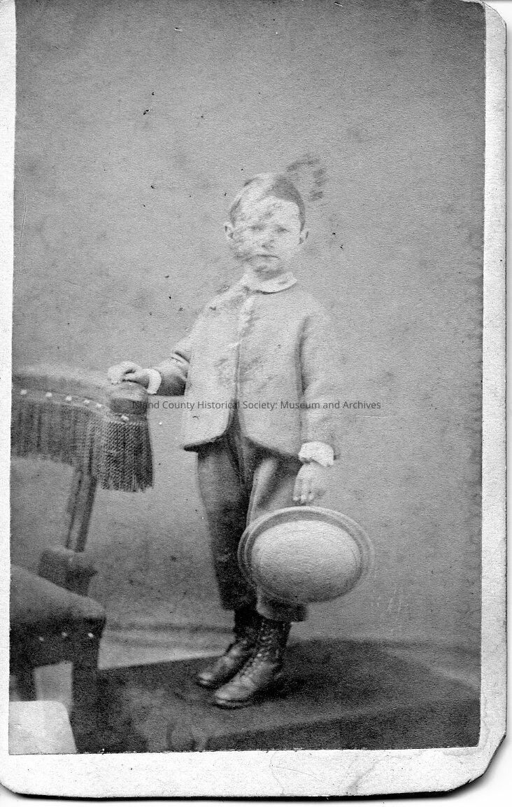 A photo of a young boy holding a hat and standing next to a chair with fringe hanging down. In Izett Family Folder.