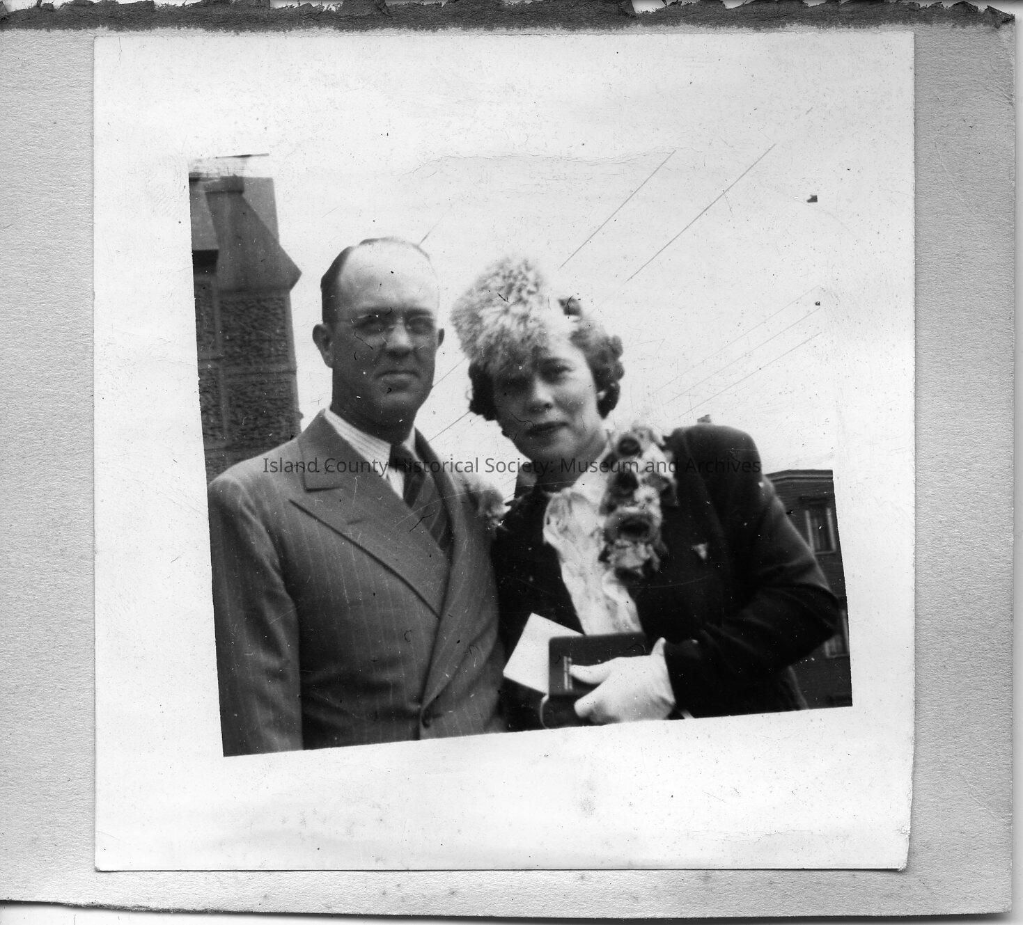 A photo of a woman and a man, outside. The woman has flowers on her jacket. Handwritten on the back is "Ted & Mildred White." In Izett Family Folder.
