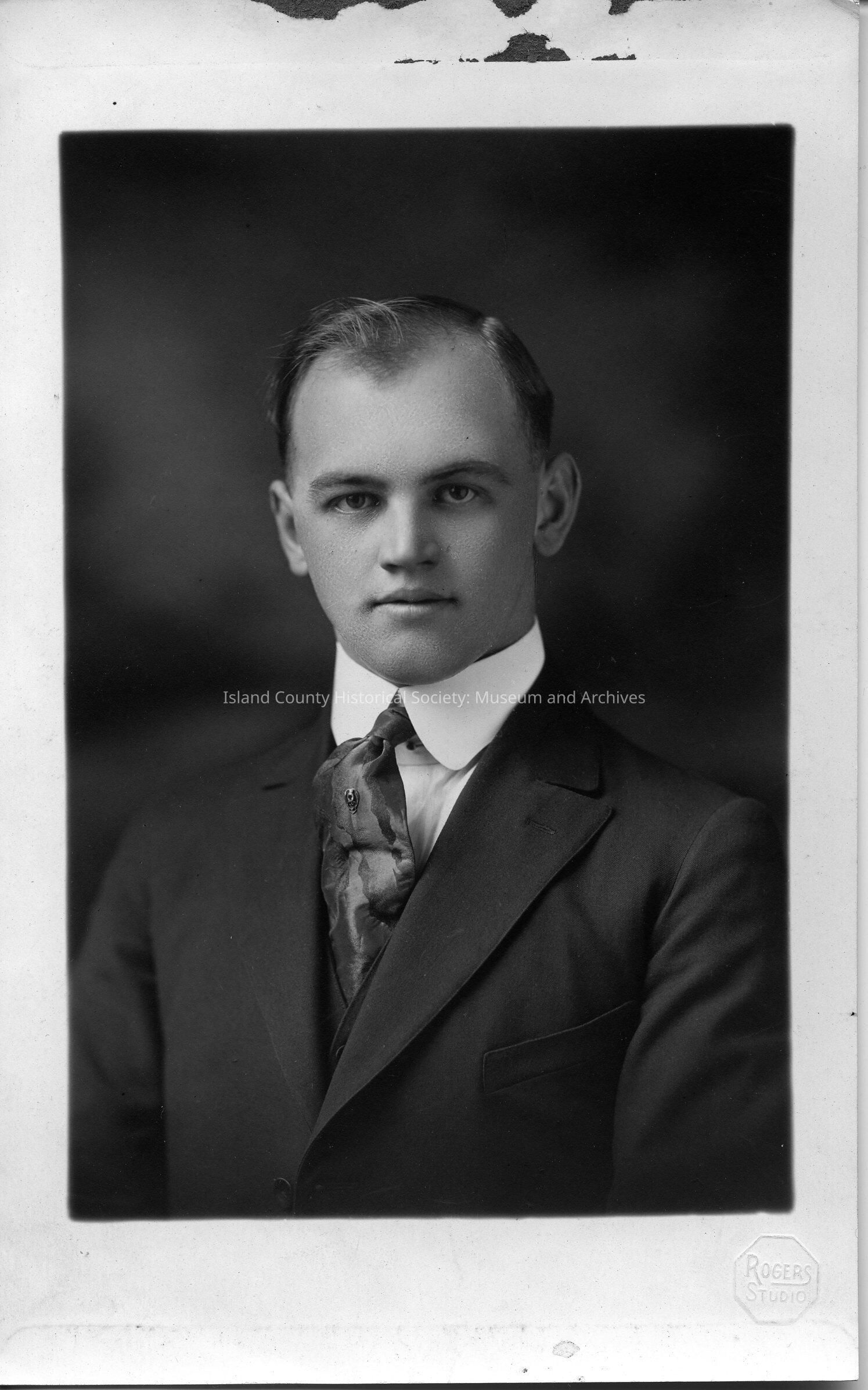 A photo of a man. He has a white color and a tie. His hair is light colored. In Izett Family Folder.