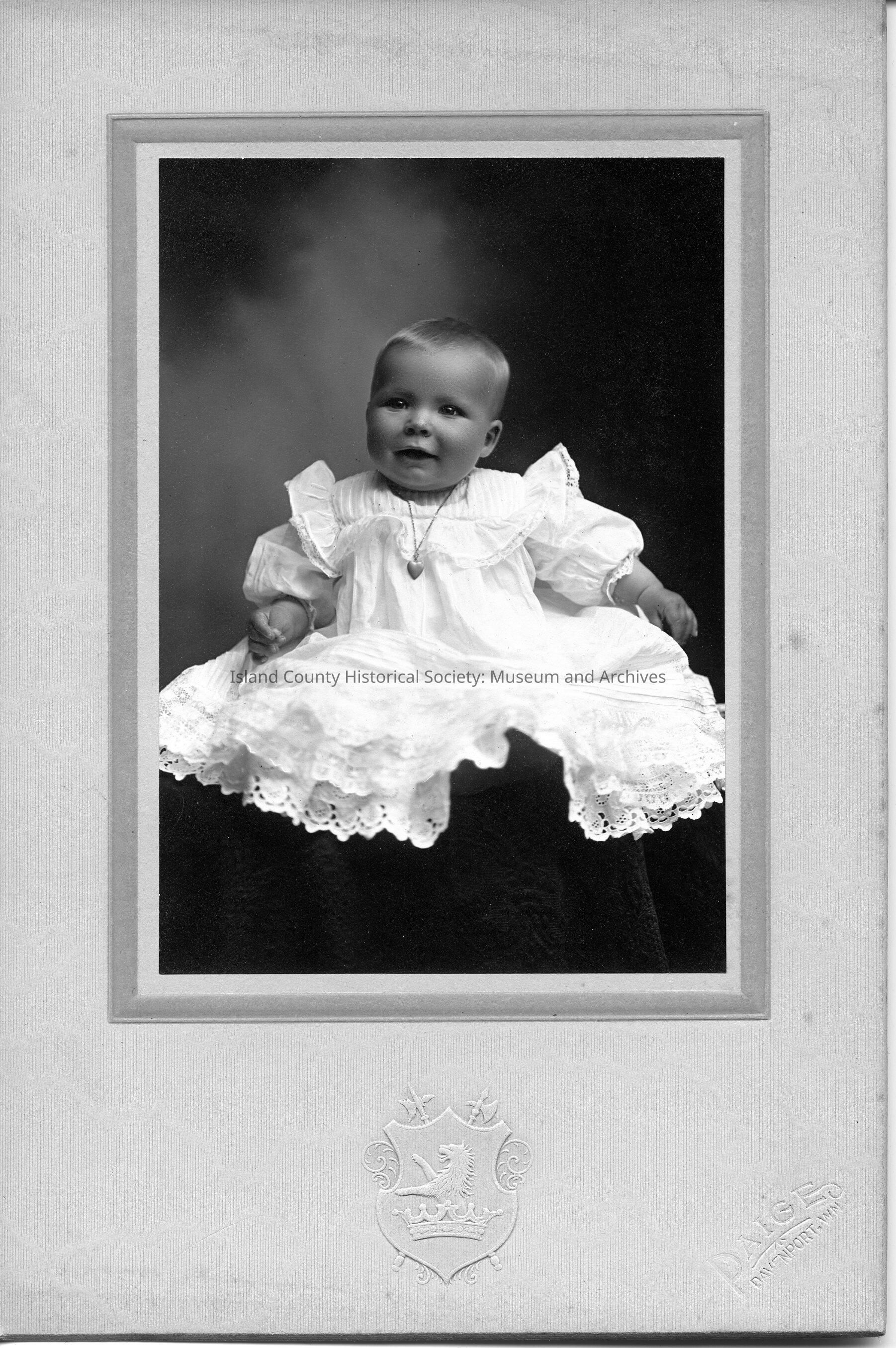 A photo of a baby in a white dress with a necklace that has a heart. Handwritten on the back is "To Will from Fred, Baby Hellen". In Izett Family Folder.