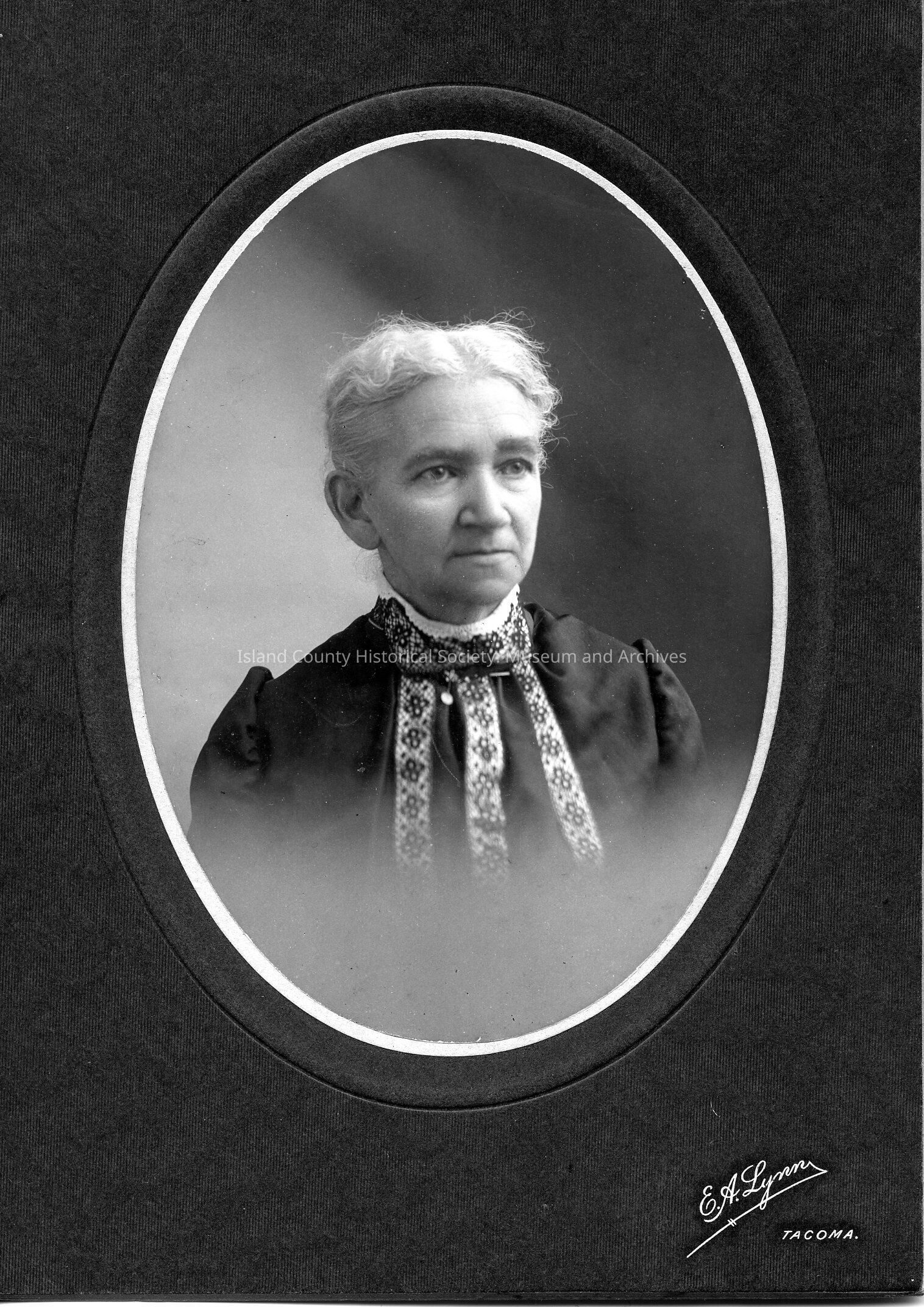 A photo of an older woman in an oval frame. She has a pattern on her dress. In Izett Family Folder.