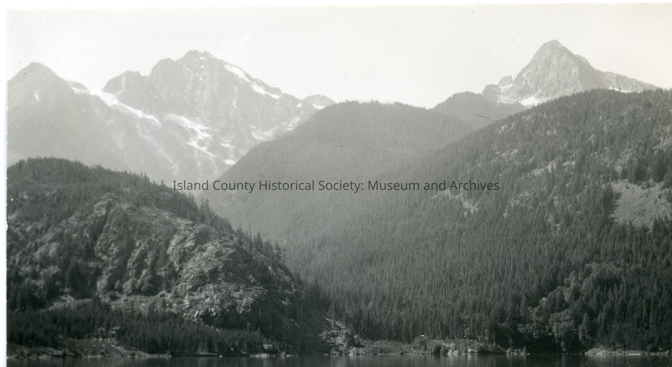 Black and white photo of Diablo Lake. Mountains with snow.