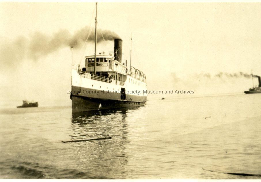 Three ferries at sea, two in the far distance and one closer up, the focal point of the photo, this one called Sol Duc. People can be seen along the side of it, looking away from where they are headed.