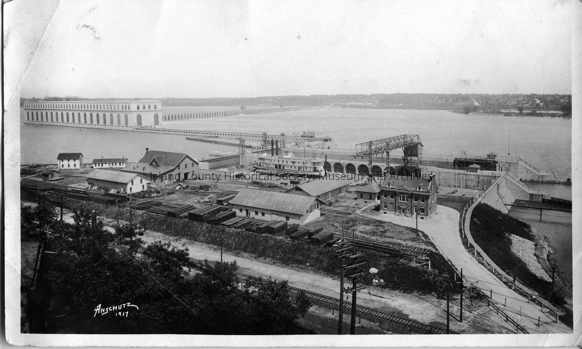 A photo of the Keokuk Dam (bypassing the Keokuk Rapids on the Mississippi River), Iowa, with buildings of the canal and dry dock. A steamwheeler is in the drydock (center) with a railway/train tracks and telephone/power poles in the foreground. Looks like railroad ties just beyond the tracks. Handwritten on the front is "Anschutz 1917." In Izett Family Folder.