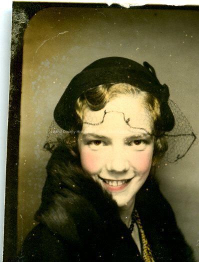 Bust (shoulders and upwards) of young girl. Hand-coloured? Girl wears fur coat, beret (or flat cap of some kind) with netting. She smiles over her shoulder at the camera. Hair tinted yellow, face tinted white and pink blush on cheeks and red lips.