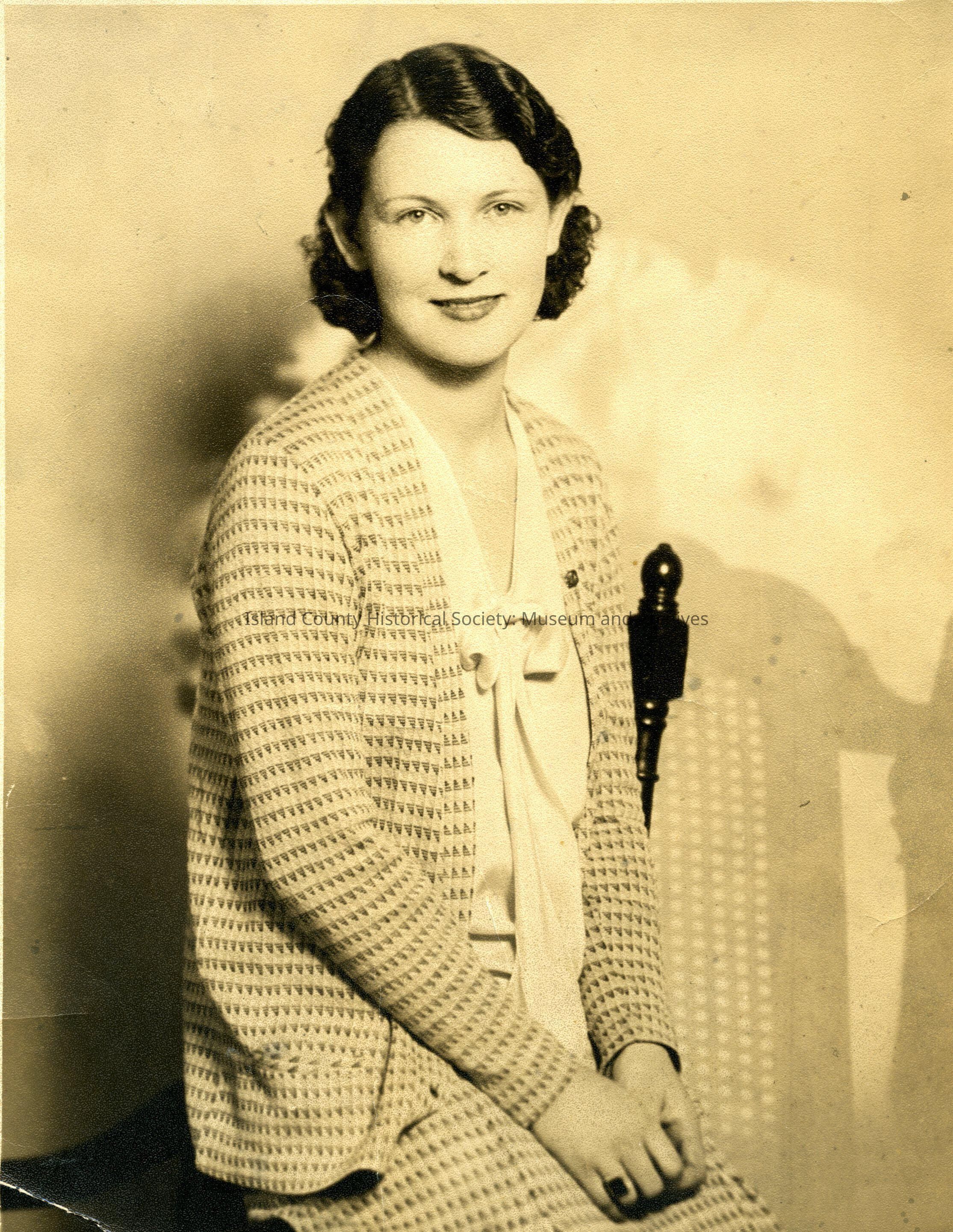 Photo portrait of young woman sitting on a chair against a plain wall background. Hands in her lap, she smiles and wears a suit of blouse with bow at the neck and matching jacket and skirt. She has short dark hair. On the back in pencil it is dated Sept. 2 1931