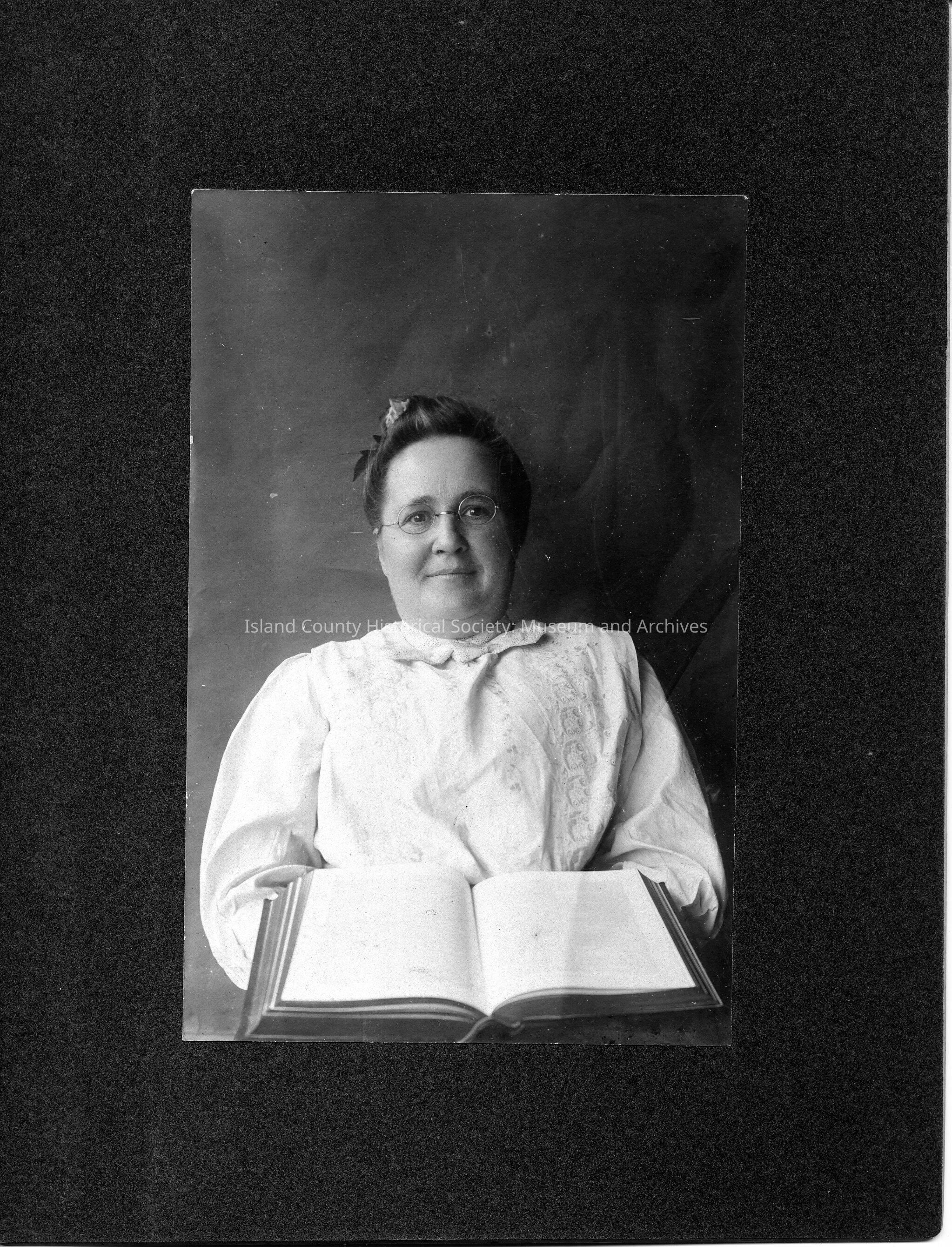 A photo of a woman in a white dress holding a bible (?) in front of her. In Izett Family Folder.