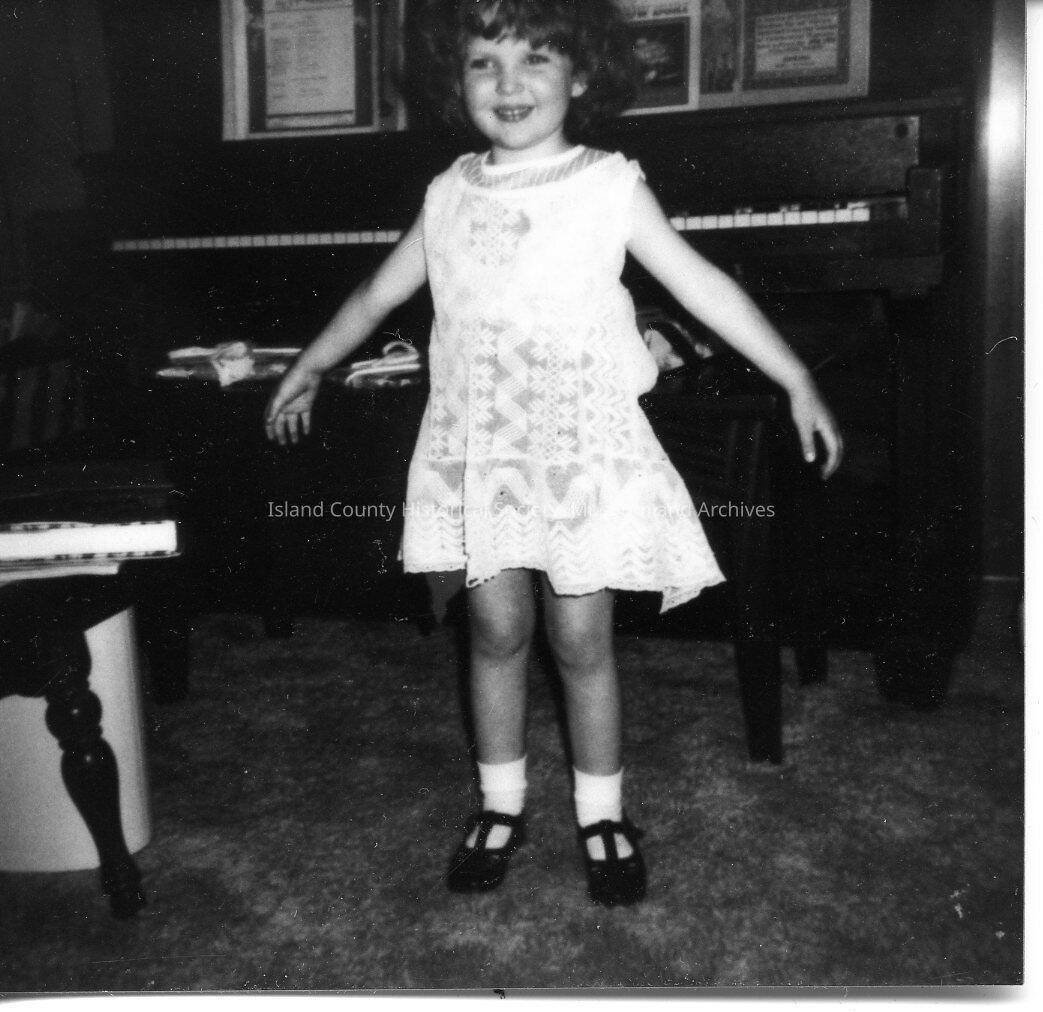 A color photo of a young girl in a white and pink dress in front of a piano. Handwritten on the back is "3 year old Amy Leynn Snow, Lansing, Mich. Great grand daughter (of) Gertude Izett Leox" The cover of the photo says "Wearing pinaforte of Darned Net." In Izett Family Folder.