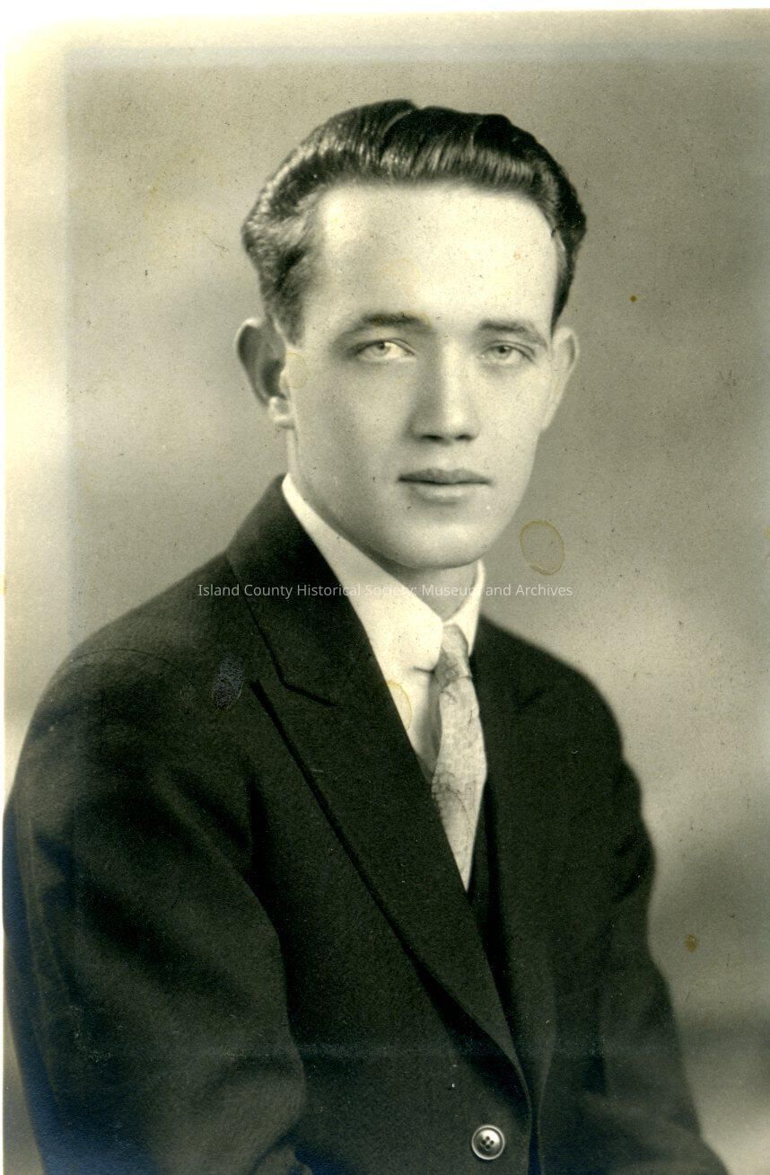 Photo portrait of young man, upper body and upwards. Clad in a dark suit with tie and dark slicked back hair.