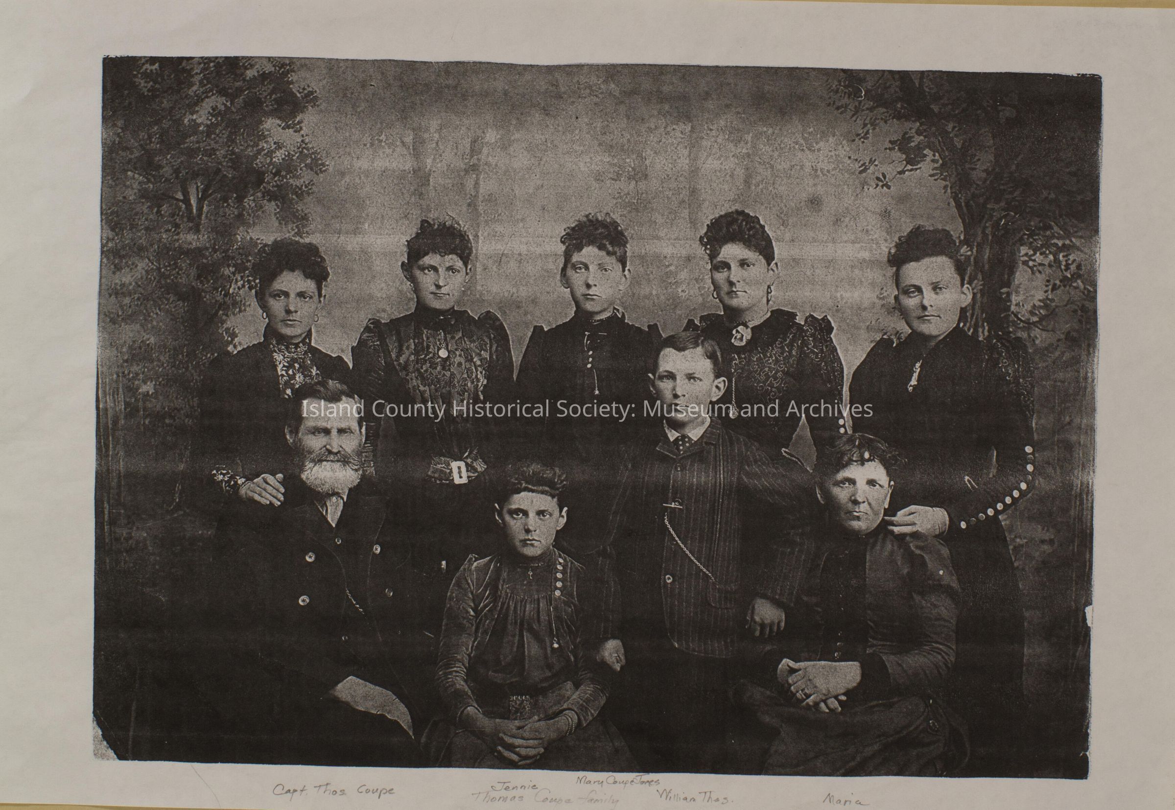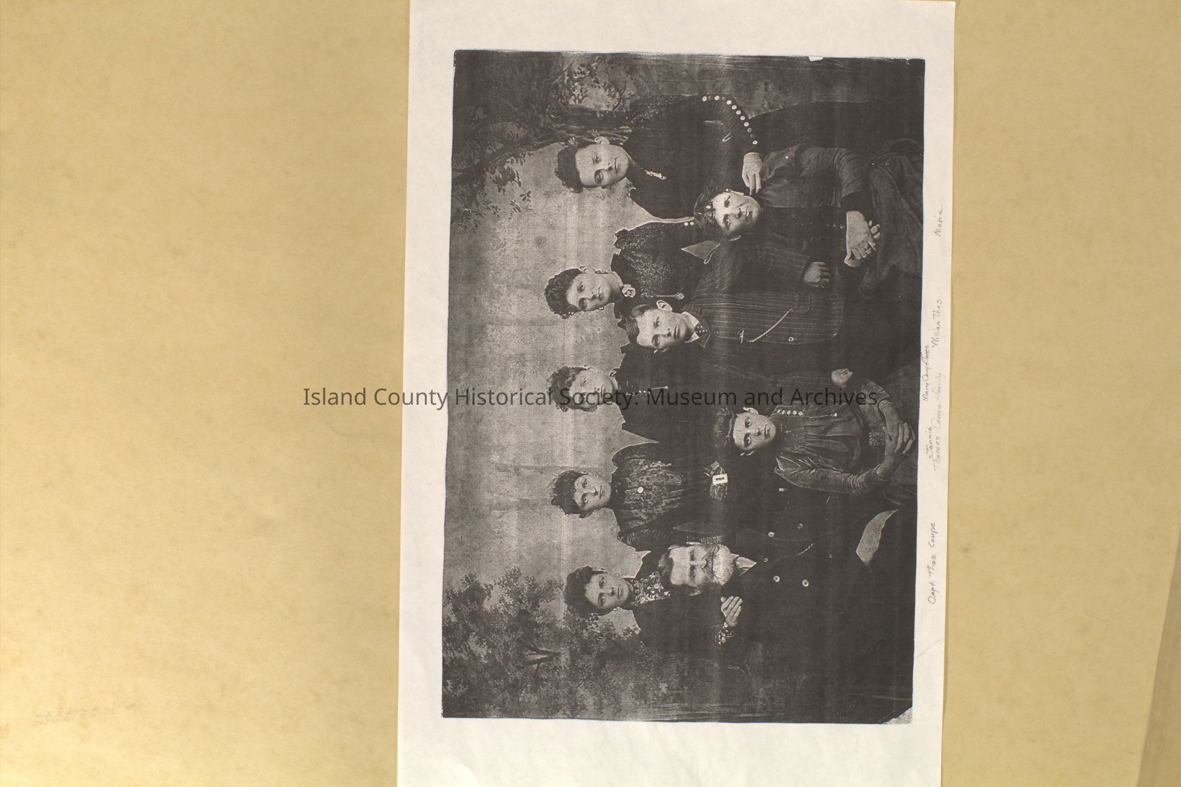 Photocopy of family portrait of Captain Thomas and Maria Coupe and children. Jennie and William Thomas are in front row. Back row includes Jennie, Mary Coupe Jones, Sarah, and unknown.