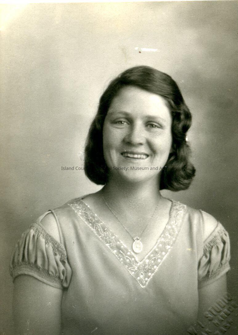 Portrait photo of a young lady. Dark wavy chin-length hair, smiling, pendant necklace and light coloured blouse/dress, short-sleeved and with decorative collar and pleating along the sleeves. On the back in blue fountain pen ink: "Miss Esther Elliott 9/23/32 "When you are feeling blue and a good laugh look at this" As Ever Finny [Fimmy/Fenny?]"