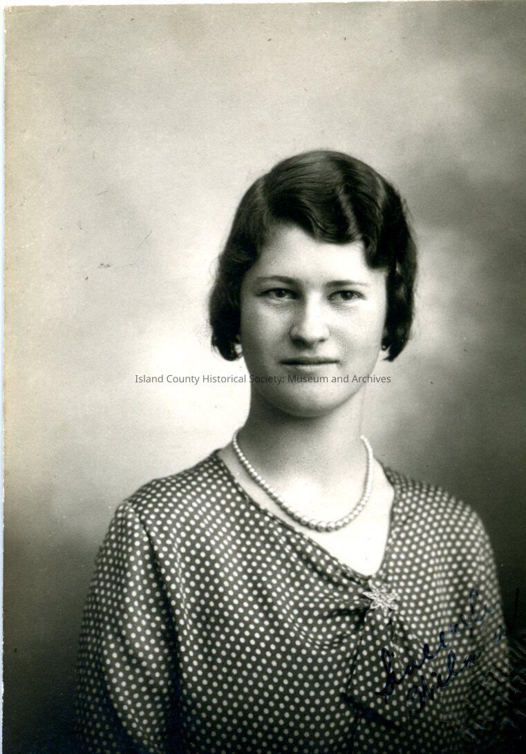 Portrait photo of a young lady. Dark wavy hair in 1920s-30s bob. She faintly smiles, and is clad in a polka-dotted blouse/dress with a v-neck. At the v-neck, the material bunches into a sort of faux tie and is adorned with a six pointed star brooch. She wears a pearl necklace.