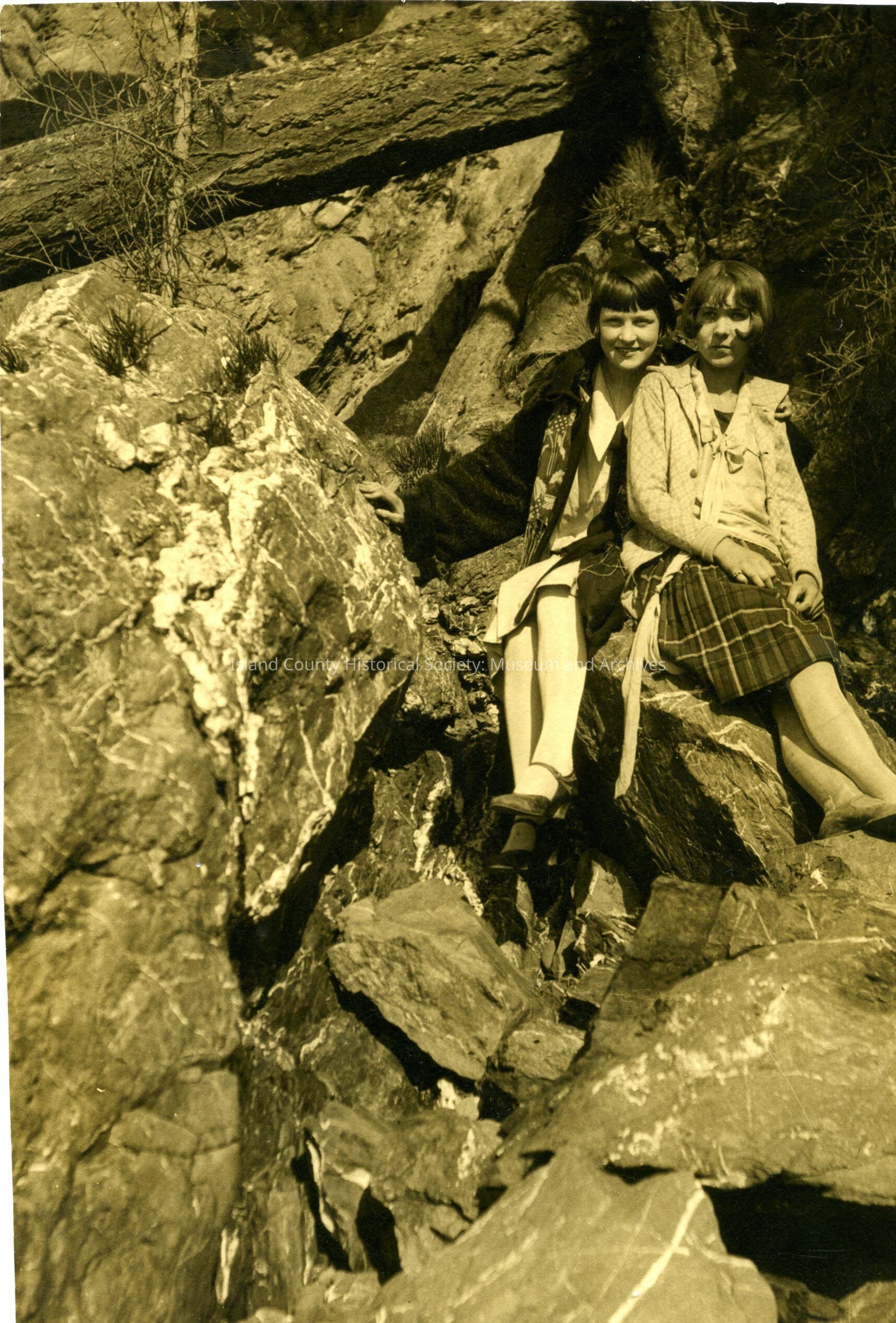 Two young women seated together on a rocky hillside. A broken tree lies lengthwise above them. Shrubbery is on their left (viewer's right) and surrounded by craggy, veined rocks. The lady on the left smiles, the other does not. Both have dark hair cut in 1920s-30s bobs. Both wear knee length skirts and stockings with long blouses and jackets. The girl on the left has her arm around the other girl.