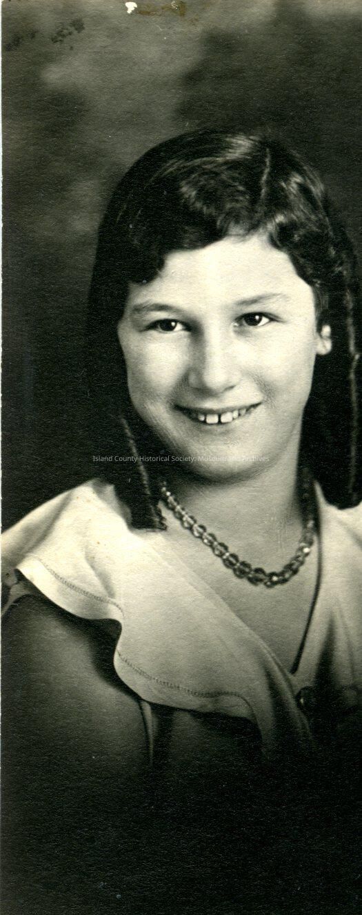 Photo portrait of young woman. Dark hair, shoulder-length and curled into thick sausage ringlets. She smiles. She wears a light coloured blouse/dress and a wide, loose collar and a bead necklace.