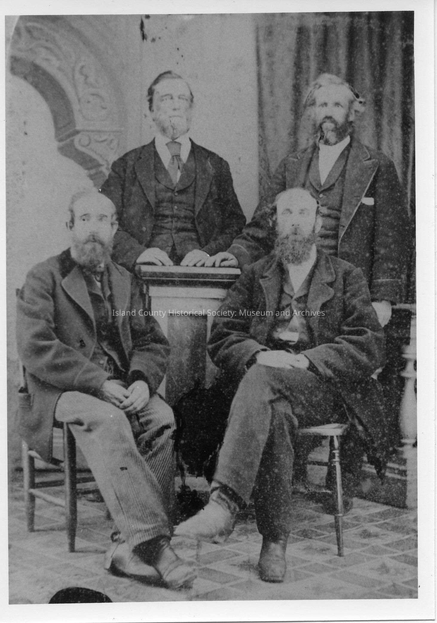 Portrait of four men: Standing left - Capt. James Henry Swift, right - Capt. Osborn H. Morgan, sitting left - Mr. Vroonian, right - Dr. John C. Kellogg. Also written on back: Union store Coupeville, retired from business about 1877, W. H. Louellen clerk.