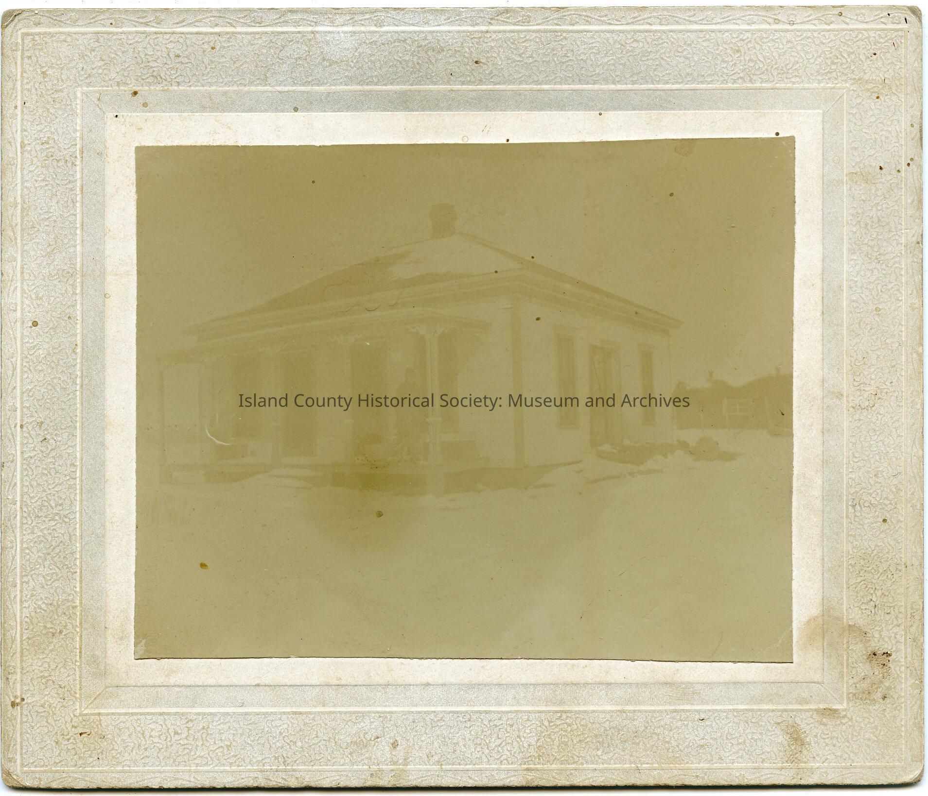 Sepia photo of a single-story house with roof sloping from a central peak with a central chimney. A wide front porch, long windows on front and side. Snow is on the roof and ground. A person is standing on the front porch wearing a hat, however it is too faint to determine if it is a man or a woman. The photo is mounted on cardboard.