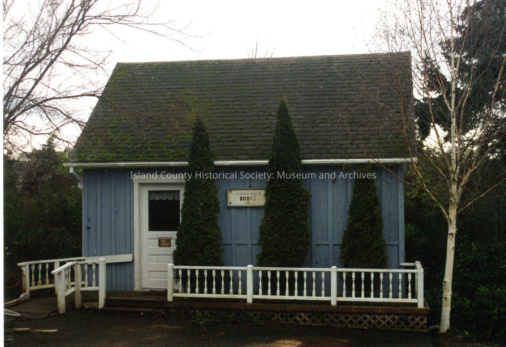 Holbrook written in blue biro on back. House of Books sign on exterior. Exterior front-on photo of small wooden building with white low-lying fence, white door to the viewer's left side and painted light blue. Surrounded by trees. Three pointy trees lined up along exterior of building, behind fence.