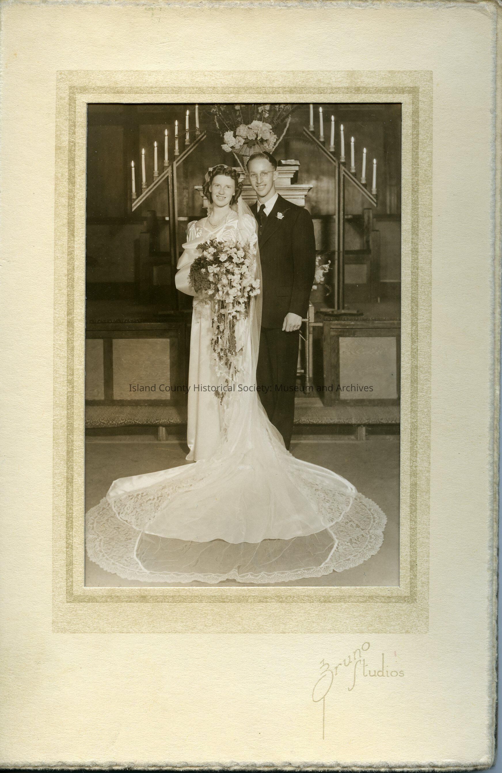 A photo of the couple's wedding, Jenne family. Candles are in lines behind the couple. A long white wedding dress on the lady.