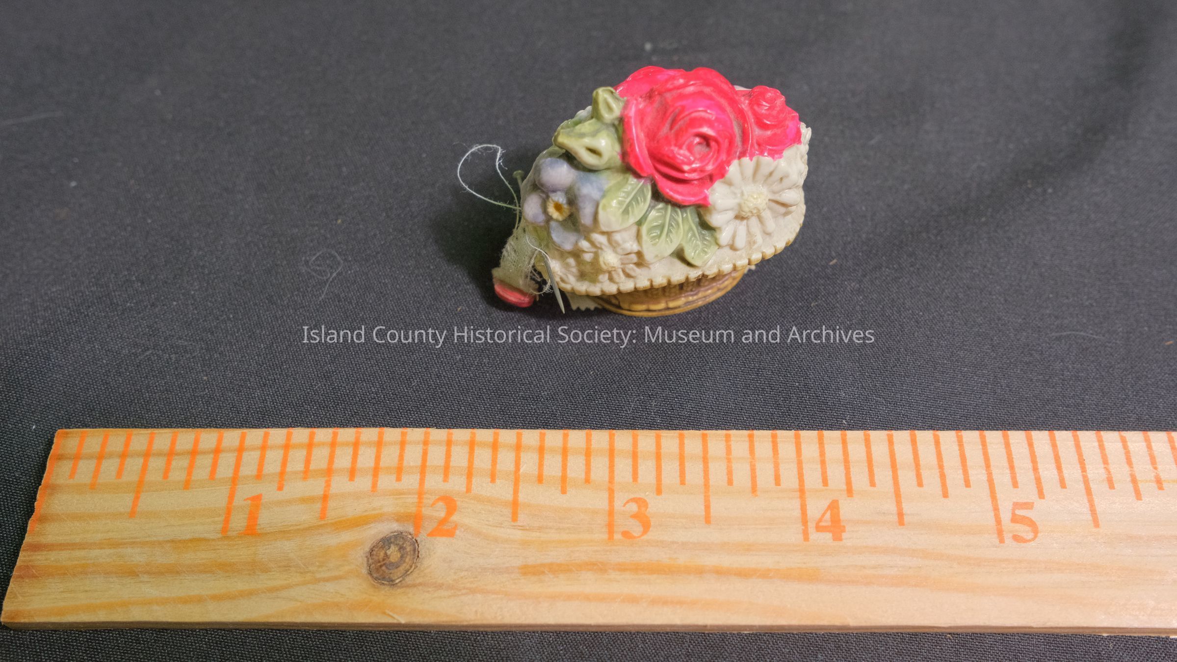 measuring tape in decorative floral basket; belonged to Dorothy Dickey, given by Murriel Short.